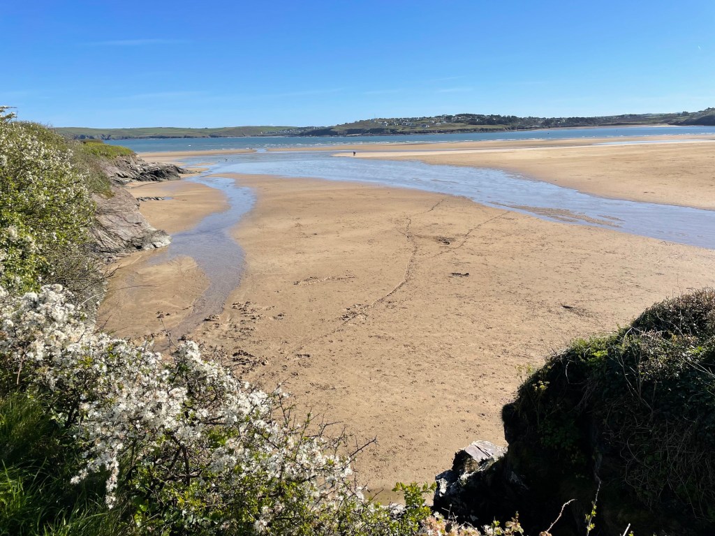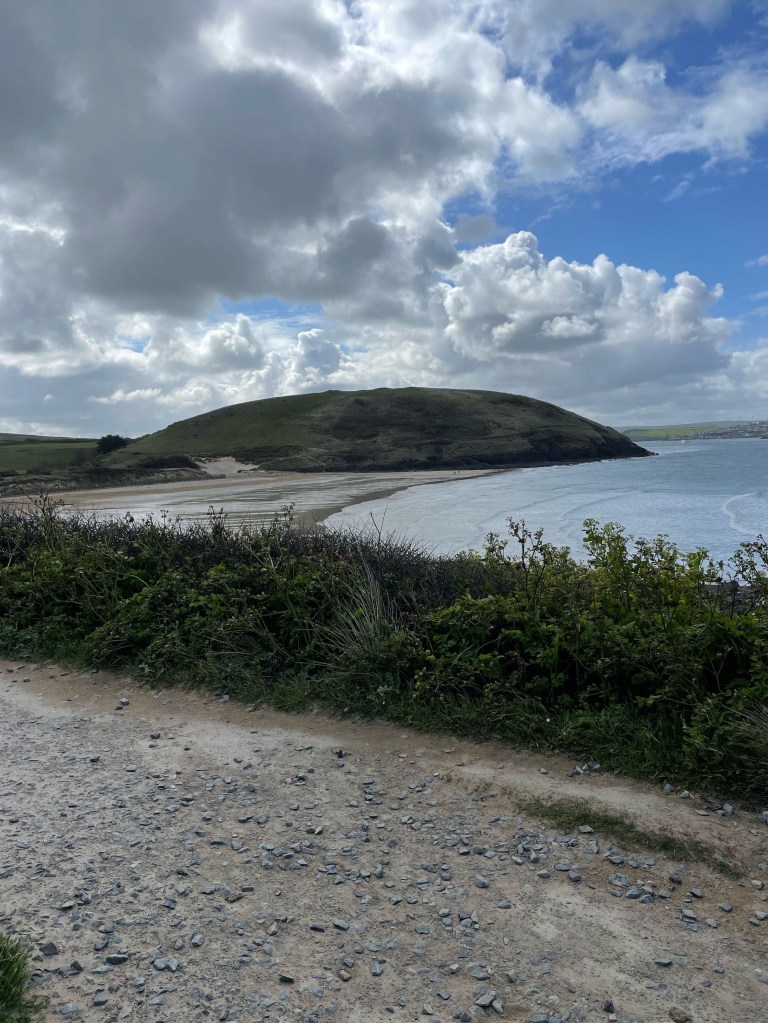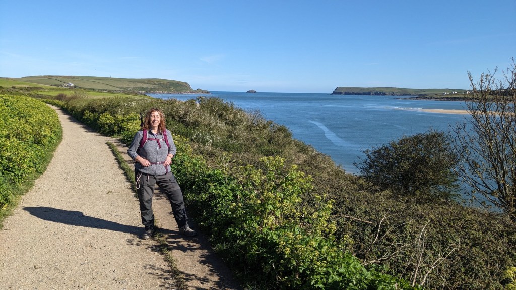 The weather had improved – there was still a fair wind, but either side of the grey cloud we couldn’t seem to escape, there was blue sky and a warmer feel overall. Conditions underfoot were excellent, Komoot rated this walk “Easy” and the path was wide and dry, if a little stony in places. It wasn’t long before we rounded the headland where the river Camel meets the sea, and here we had our first sight of Padstow on the other side. The trendy village of Rock lies opposite, but was obscured from our view by the huge round feature of Brea [pronounced bray] Hill. This is of particular interest, as my maiden name was Bray, a very common name in Cornwall, which originates from old language meaning “the brow of a hill”. Maybe this was the very one!