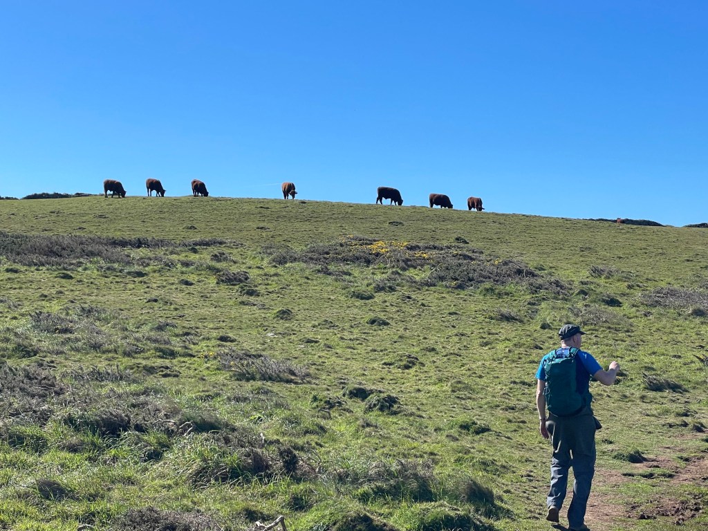 About half a mile further on was a tower, the remains of the old lighthouse, which never actually had a light, it used to be painted white. We could see the modern lighthouse on the next headland, Trevose Head. We were really enjoying ourselves now, I think this stretch must be some of the easiest going on the entire Path, and the weather was glorious [see, it’s really not all doom and gloom!]. There were some cows loose atop a nearby hill, but not close enough to warrant any panic, but as we approached a downhill section, Paul suddenly realised his hands were empty-where was his walking pole? There was only one place it could possibly be-Stepper Point. He’d put it down to sign the book. It was too far behind to contemplate returning for it, so it was with a sense of dismay and frustration that we carried on. I suggested we could ask the girls to buy him a replacement for the upcoming Father’s Day.