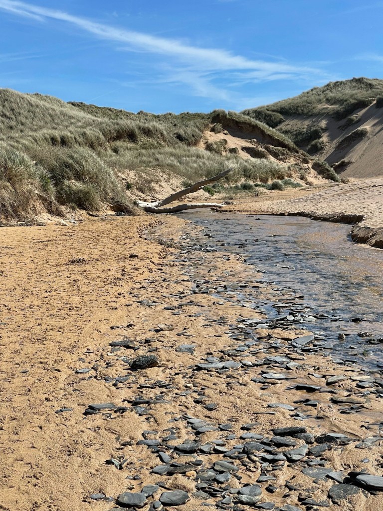 As the beach looked tempting, we left the official path to stroll across it. There were a couple of rivulets to cross, but also handily placed stones to keep my feet dry [Paul’s boots are waterproof, but my “breathable” ones mean water over an inch deep gets inside!]. We headed back into the dunes as we tackled Brea Hill, swiftly ascending via Paul’s least favourite kind of path; the ones close to a steep drop!