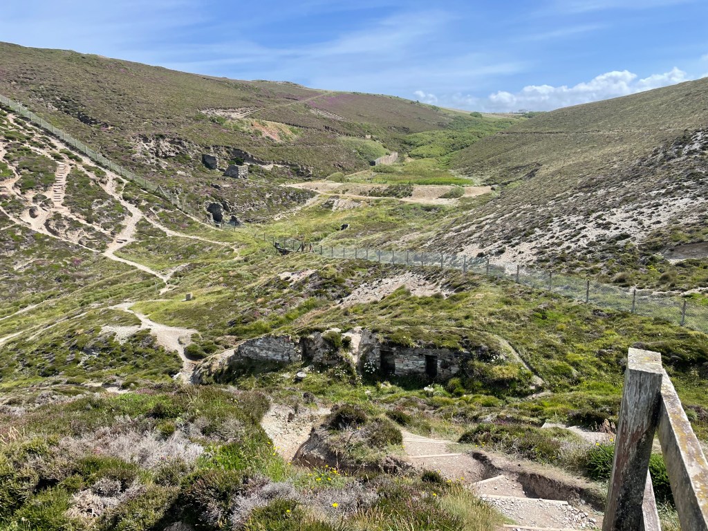 The stamp for West Cornwall is a mineworks tower, and this stretch had plenty of evidence of former mining activity, in various stages of ruin. Some buildings were barely there, but another, though a shell, still had a complete tower. Sometimes they just popped up in the natural landscape, but we also walked through one area totally transformed, with mini mountains of loose stones and spoil.