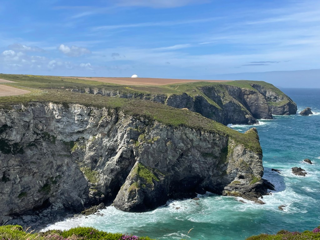 After brekkie we made our way through the village back to the beach, where we picked up the Coast Path, heading uphill with plenty more wildflowers lining the route. There was a fire engine in a car park by the track heading out onto the cliff top, and we saw evidence of water spillage. The smell of smoke preceded our coming across three firefighters, digging out blackened soil right on the cliff edge. We stopped for a brief chat before resuming our journey along the cliff. Paul had asked about RAF Portreath, as we were about to pass the perimeter, but were told it’s mostly a listening post, there was no flight activity apparent. All we could see of it was a massive white sphere. By noon we had covered the 2 1/2 miles to our planned lunch stop at Porthtowan. I got my passport stamped, and then we had a good rest at the Beach Cafe.