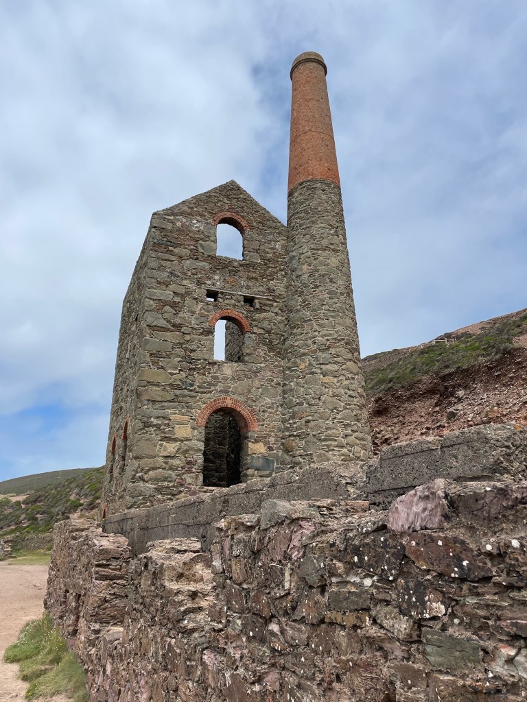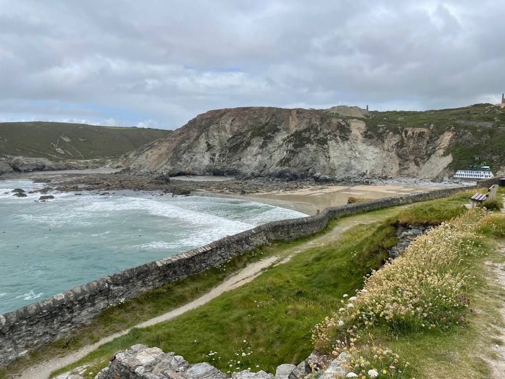 It was double misery, as the ground was horrible to walk on, sharp, stony, loose scree, especially nasty when your feet are still feeling tender. I had forgotten about the ascents until I looked at the stats again, they were quite significant today, but it was mostly steps, so easier to rest in places. [I posted a teaser photo back in June with me pulling a face at a huge flight of steps ahead, and it was taken on today’s section]. A little joy was restored with an ice cream at Chapel Porth, and by the time we left, the sun was attempting to break through again.