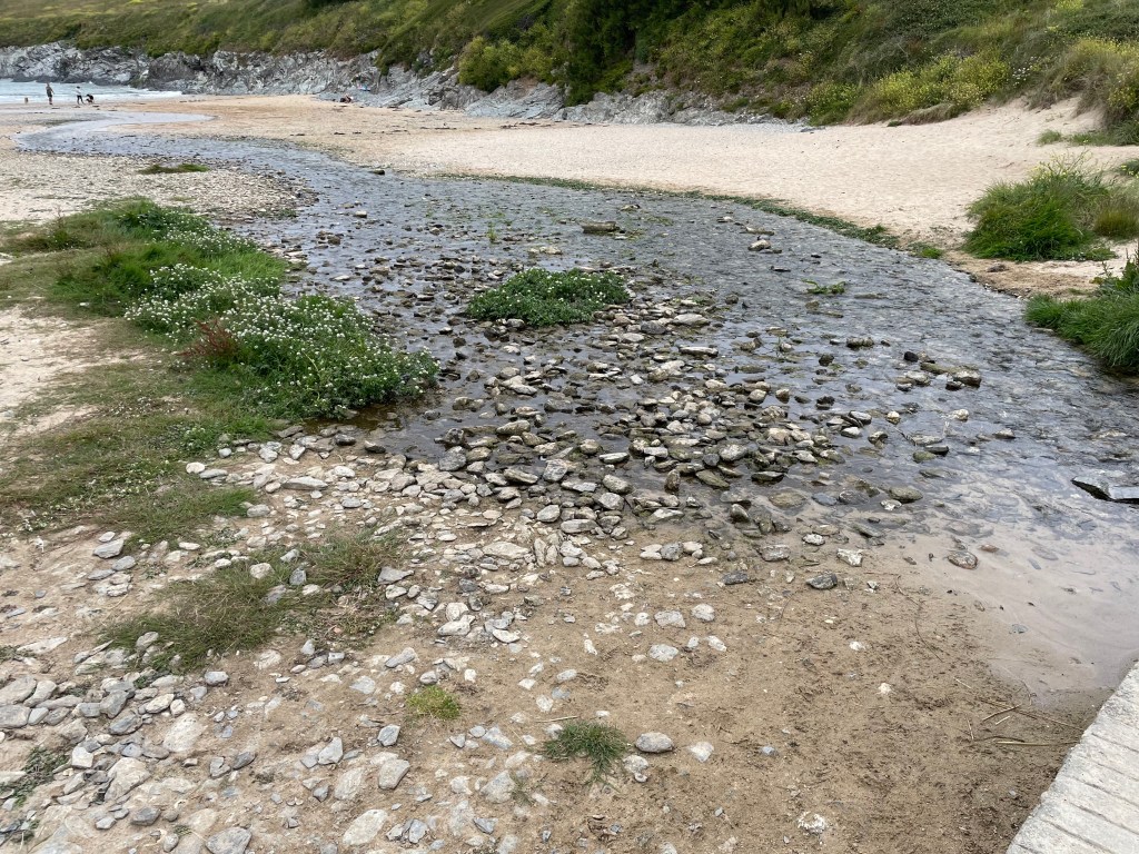 As soon as we hit the coastline, we were faced with the dreaded dunes and multiple paths, so it took us a while to get on the exact route. The sand was nice and soft underfoot, but our feet sunk so deep our boots began filling up with the stuff. The hills were small, but we were up and down repeatedly; I began to take fast little steps to out run the sinking! It was a relief to get through it and rest on a grassy knoll, whilst emptying our boots. Mine were now in a very sorry state, I just hoped they would last for this day and the next. Fortunately, the going improved, the biggest hazards now facing us being heaps of sheep and rabbit droppings! [The sheep themselves I didn’t rate as a danger, as they seemed too busy trying to annihilate themselves, resting and walking right by the cliff edge.] We had a bit of an easier stretch here as we made our way towards the oddly named beach of Polly Joke. A footbridge took us across the stone strewn inlet, after which we ascended the headland taking us to Crantock. Our target was the Bowgie Inn, a stamping point, so we waited ten minutes for it to open at 11.45 am [the sign for Tarquin’s Gin had absolutely nothing to do with it. Well, maybe a little…!].
