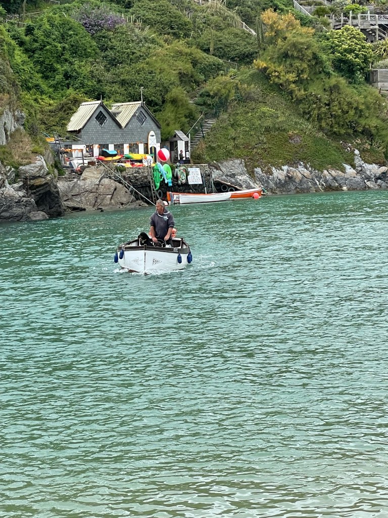Suitably refreshed, we continued past Crantock, which included fighting our way through some foliage [a regular feature of the Path]. We knew we’d have to cross the river Gannel shortly. A check of the tide times showed that the water was too high for us to attempt walking over the footbridge, so we made our way through the beach car park, and across the sand to cross via the Fernpit Ferry. As we approached the water’s edge, we could see no landing place or signage, but luckily, there were a few people waving and whistling towards the small hut opposite, and we realised this was how you attracted the attention of the ferryman! A small boat soon headed our way, and a few minutes later and a few quid lighter, we were on the other side. A long and steep flight of steps was the only way onward. At the top, we were walking on normal paths through the residential area of Pentire. We hit Fistral beach next, buzzing with surfers and holidaymakers, at the end of which, we stopped for a Cornish pasty for lunch. The rest of the walk took us through Newquay, familiar territory from our previous walk, just much busier. Paul’s feet were hurting him, and mine were pretty tired, so we both collapsed on the bed at our accommodation, thinking we’ve only got one more short walk to go-we can make it, can’t we?
