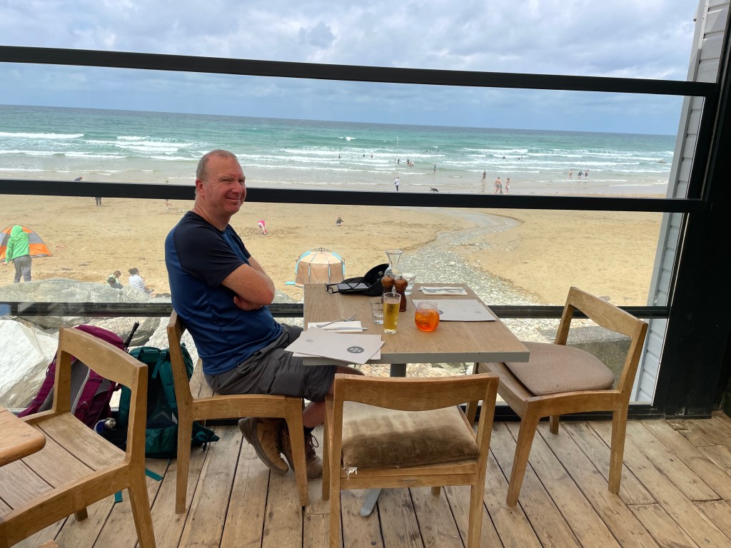 Watergate Bay was our lunch stop, in a restaurant with a table overlooking the beach. Bit posher than usual, but it was the last day of this leg! Paul said his feet were all right, and we were making good time. We didn’t want to linger unnecessarily, as we had the drive home ahead. A steady ascent ensued, with a good path once we hit the cliff top. On the outskirts of Newquay, we rested at the Jumpen Cafe, another stamping point, where I was apparently the first person to ask for a stamp, despite them having it for nearly a year! We looked quite close to the town at this point, but according to our Komoot plan, we still had two miles to go.