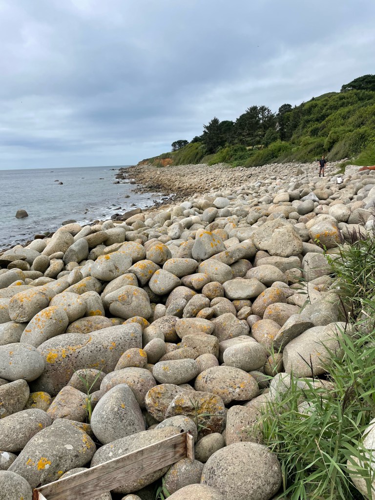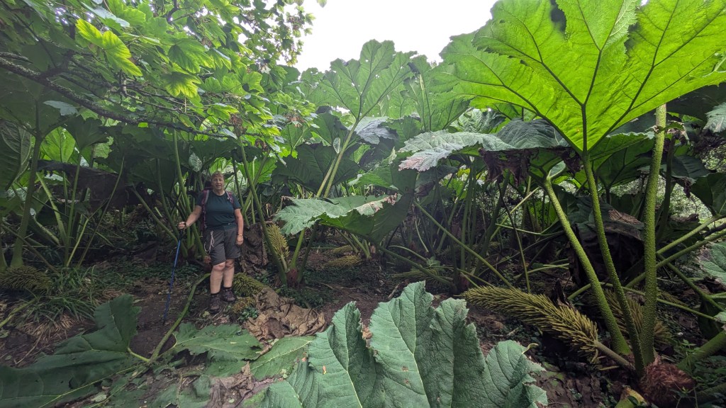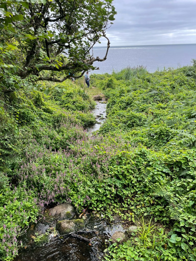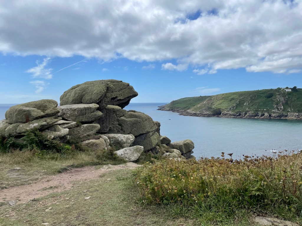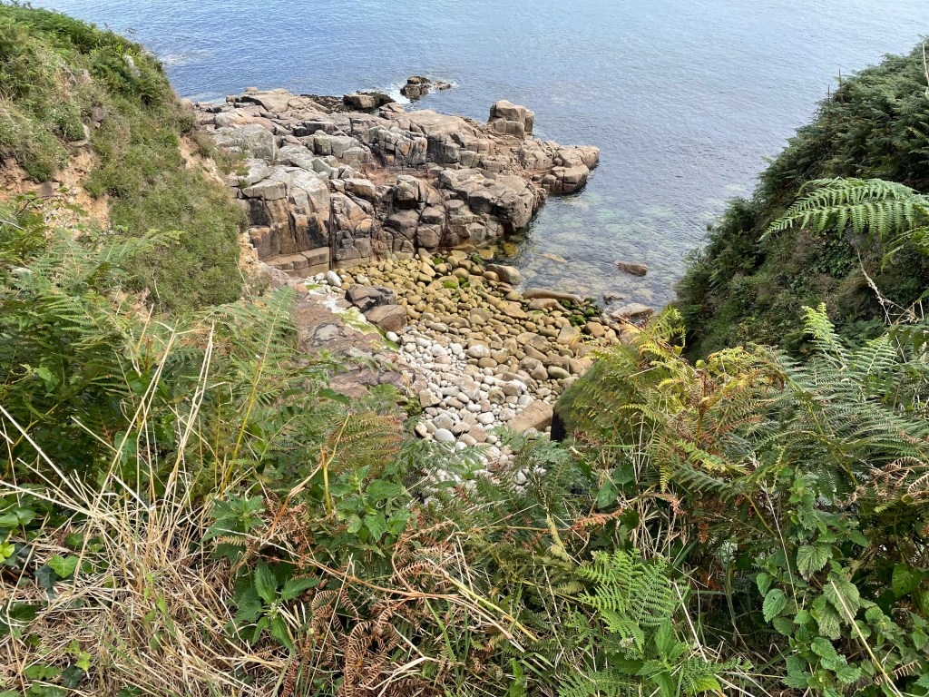 It took us 35 minutes to pick up the coast Path at the tiny cove; a house, a couple of boats and a small beach, so far, so typically Cornish. But we must have soon come across this area of huge Chilean Rhubarb plants-Paul made me stand in the photo for scale! But for the most part, the morning’s walk was very typical Path-down into a cove and back up again, but reasonable going on the tracks where it levelled off. We were no longer walking into a headwind, though a cooler breeze would have been welcome on this overcast and muggy day. Still, we made good progress on both the open track and through some woodland until 11.15, when we had to cross St Loy’s Cove. No sand on this beach though, not even shingle, it comprised massive rocks that we had to walk over. Paul took some footage of me negotiating my route, so amuse yourselves at my expense! View it with the link to this blog on my Facebook page as I can’t show video on this free website.