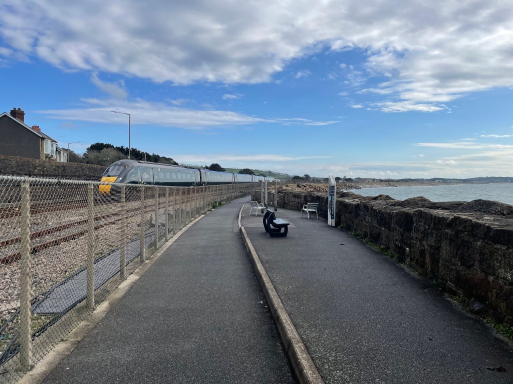 Who knew that simply finding a car park could be the trickiest part of our journey along the SWCP? Our drive to Falmouth had been smooth sailing, but as we approached the town, the satnav took us off into a residential area away from the coastline where the parking was located. The roads got narrower and narrower, steeper and steeper, but I realised we were up on a higher level, and it was unlikely this route would get us to the car park. Still, Paul persisted until we literally reached a dead end. So I used google maps to navigate us around the town to approach from the south-all good until we reached the main shopping road which was signed no entry for cars. We circled again and this time tried to approach from the north, which was more promising until we got to a road closed sign-this must have been the reason the satnav couldn’t get us there. For the third time we circled around, this time aiming for a long stay car park by the station that Paul had spotted earlier. He was getting a little tetchy at this stage [understandable, although it was me at the sharp end!] but fortunately, we made it to the Plan B car park. We gathered our belongings and then had a bit of a wander around while we attempted to find the actual station, as the next stage was to catch the train to Penzance. It wasn’t surprising we missed it-there is no station, it’s just a platform and a shelter! The tracks were covered in weeds, looking as if it hadn’t been used in years, but a few other people were waiting, and right on time, a train turned up. By the time we got to Penzance it was raining, but I had booked a stay in a pub a mere 100 yards away [it’s almost as if I planned it!] so before long we were warm, dry and resting.