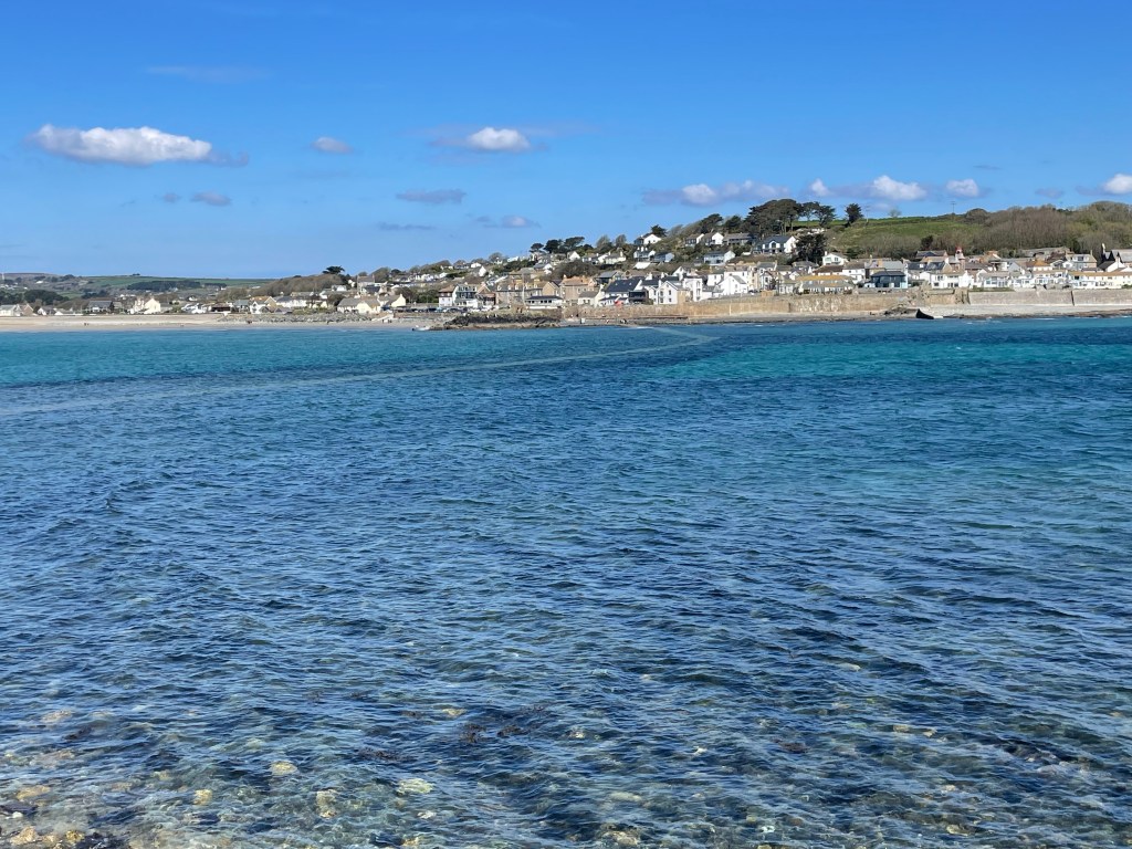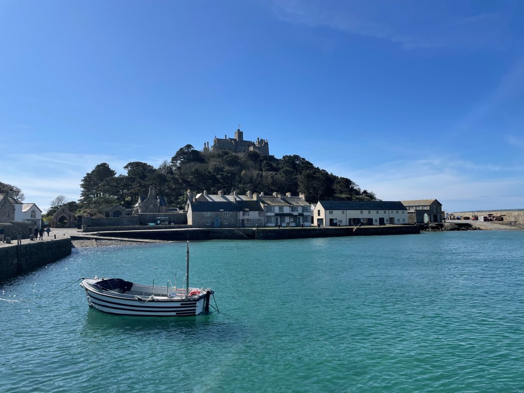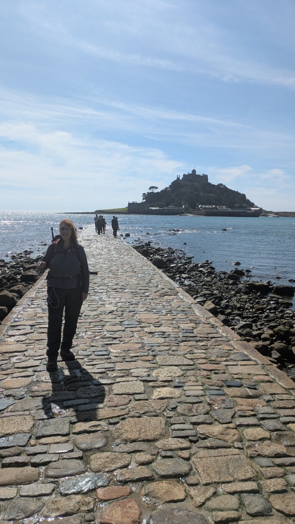 The next day began with a moody atmosphere, but with the promise of sun later. We left late, at 10 am, as we had a modest walk to start this week off. The first three miles to Marazion were very easy, a tarmac path running between the railway line and the sea, adorned with modern sculptures at regular intervals, and St Michael’s Mount in the bay. At Marazion, we bought tickets to visit the Mount-the tide was still quite high so it was a pleasant boat ride across to it. We didn’t have time to see the castle, but we did visit the museum, detailing the history of the resident family and islanders, before staying for lunch. I got my Coast Path passport stamped there [they have a special one of the Mount, not the usual wheal mine stamp for this region]. We decided to get the last boat back to shore so we could continue on our walk, otherwise we would have been stuck until the causeway was completely visible, though we did get to walk on it a little as the tide was on its way in.