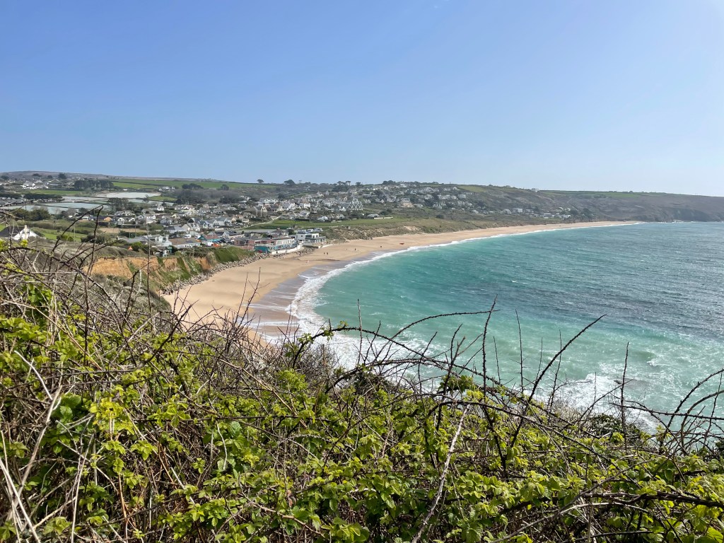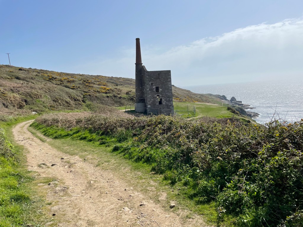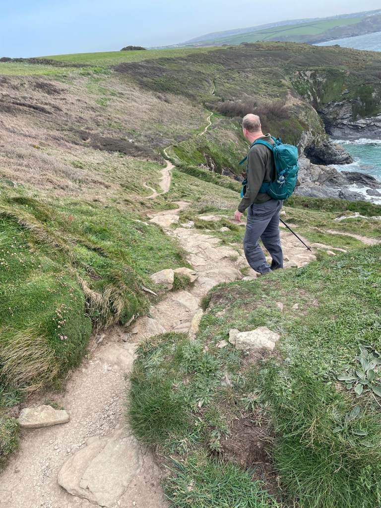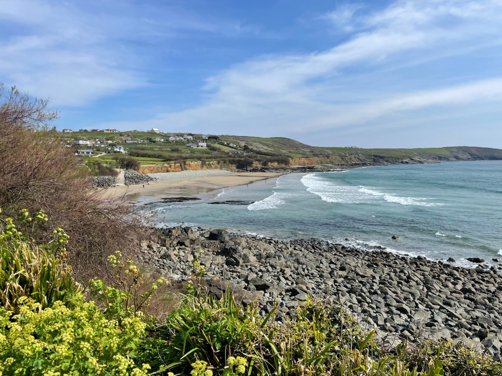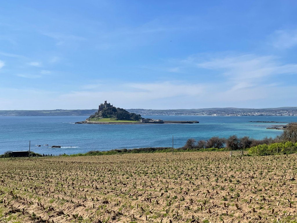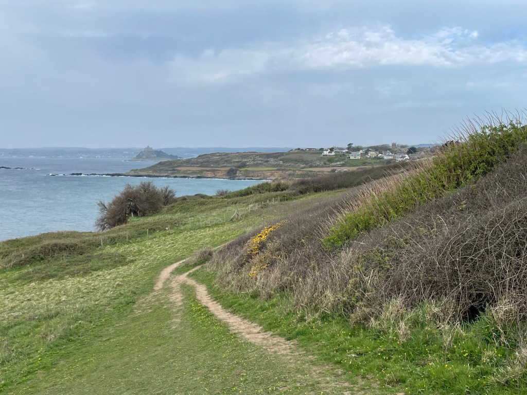 By 1.30 pm we were heading out of Marazion, the sun had appeared, we’d eaten our first Cornish pasty for lunch, and we were feeling good. We knew we would have to leave the road and head back to the coast at some point, and I soon spotted a sign-Komoot did not agree, it had us continuing along the road further, but we decided to follow the sign instead. Following Komoot blindly had got us into trouble in the past, but then again, so had ignoring it! All was well this time, we just walked alongside a field instead of the road.