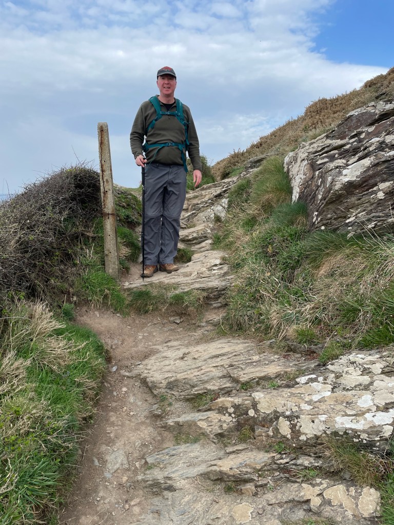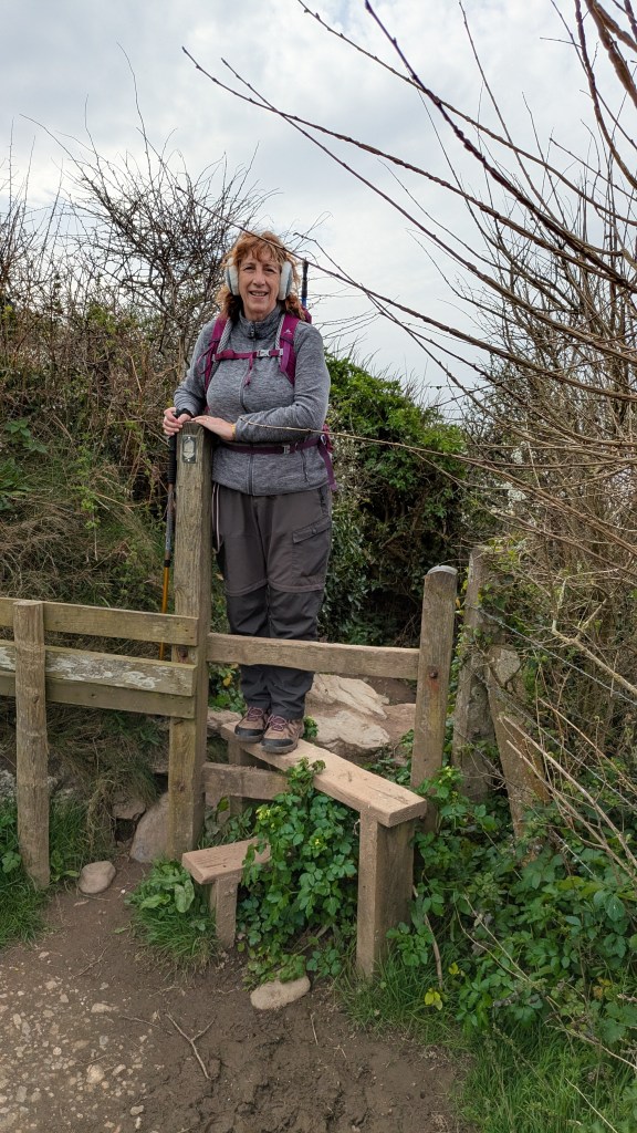 We’d set off at 9.45 am under a cloudy sky, on a track through grass, with occasional scrambling and steps up and down, but all fairly moderate. The wind was already quite strong so I had deployed my ear muffs. For the first time in ages, we passed through a couple of kissing gates and stiles-there had been a complete absence of these on our previous leg. Some stiles can be tricky if you have to cock your leg up high whilst managing a couple of walking poles!