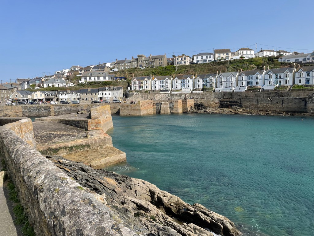 Until we approached Rinsey Head, it was easy going, including a bit of tarmac relief, and we even had some respite from the wind as we passed alongside the ruin of Wheal Prosper Mine. I’m afraid that was short lived though; the worst part of the day was about to hit us, as we headed up to the top of Trewavas cliffs. We were suddenly exposed to an onslaught of gusts, just as we were walking over an unstable rocky surface. There are no photos of this as I was gripping my poles and using all my balancing abilities just to stay upright. I used the word ‘brutal’ to describe this in my voice memo, as my legs were so tired now. On heavy legs, the last mile and a half into Porthleven was a slog, despite the fact we weren’t always walking into a head wind, though we did get walloped by a final last blast as we reached the harbour.