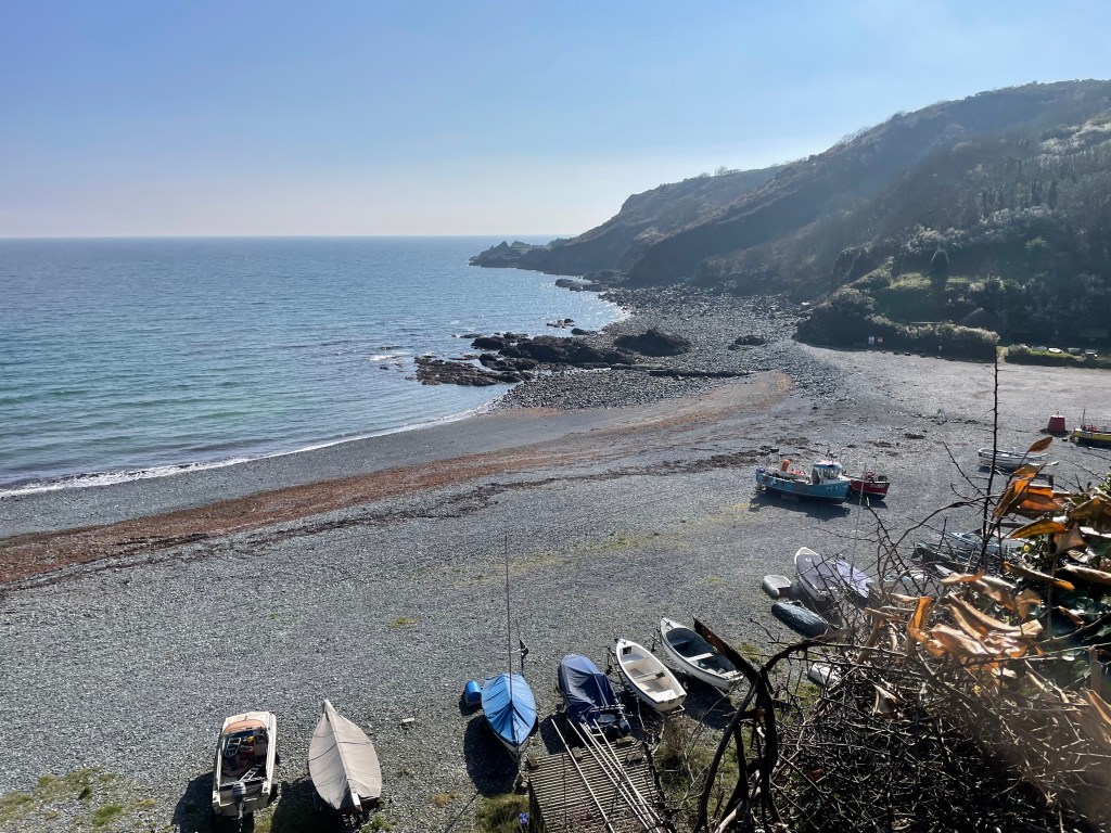 We had a late start, setting off at half past ten, heading back through the village to the shingle beach, which had a smattering of coloured boats upon it. It was a glorious day, such that after the usual ascent out of the cove, it was fleeces off.