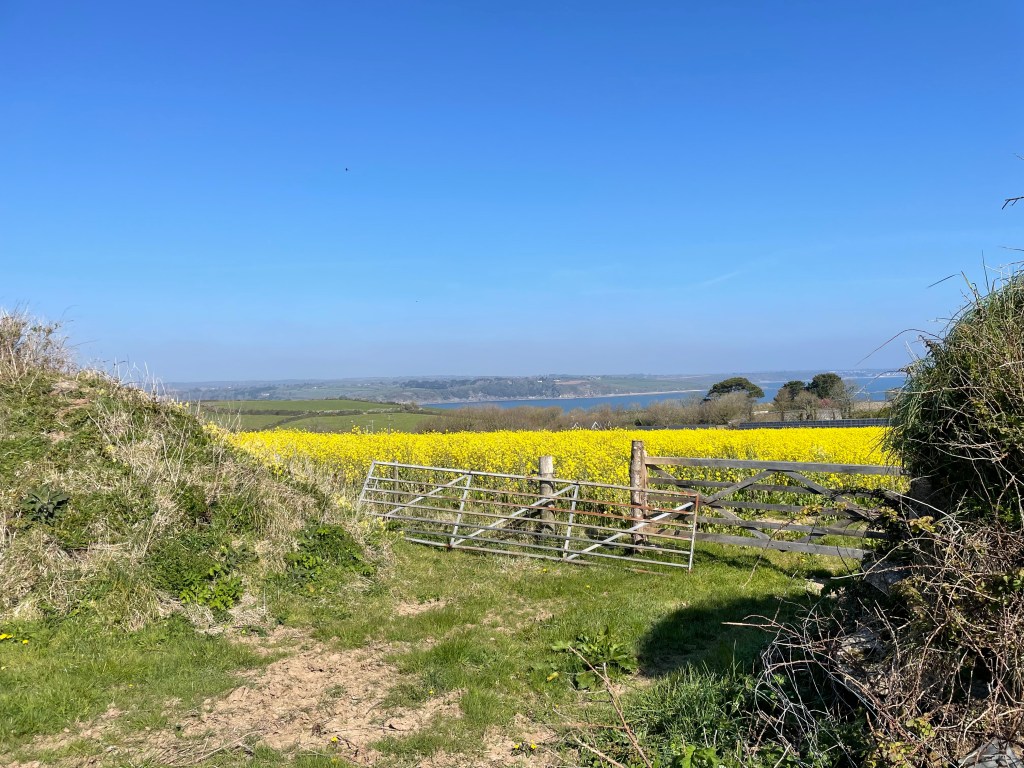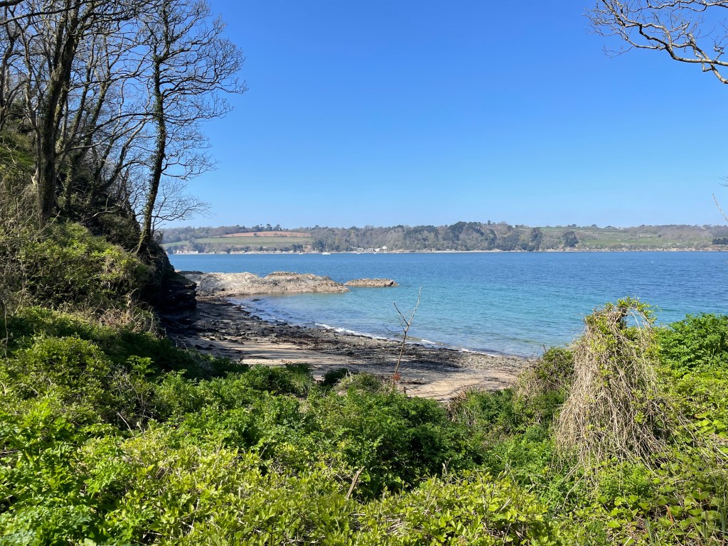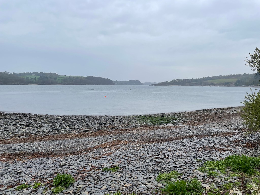 After an hour, the path took us inland, along a road through the village of Martin. Then there was a signpost heading into a field (and Komoot agreed) but we soon came up against a metal fence that was tied very awkwardly to a hawthorn bush. We managed to wrestle it open, only to be faced with a taped off section which the App indicated we should cross. In fact, we thought we could see the exit directly opposite, but there was no way we were going to crash across the barrier! We checked to see if there was an exit in the adjacent field, but no luck, so we felt the safest thing was just to go back to the road and walk around. Unfortunately, this took us on a rather circuitous route, and we arrived at Gillan Creek further inland than we were expecting. The creek has a ferry crossing to St Anthony in Meneage, but at low tide, there is a series of stepping stones for walkers to reach the other side (though I was nervous about doing this). However, there is a walk around through woodland, which adds about a mile and a half-as we were already part of the way along the creek, we decided to pursue the walk around. It was lovely to get some shade in the woods at the same time! We were glad to have a rest at St Anthony at the shop/ferry point, enjoying both an ice cream and getting my passport stamped (the vendor was delighted to finally get the ink pad out of its wrapper, as I was the first person to ask for a stamp!).