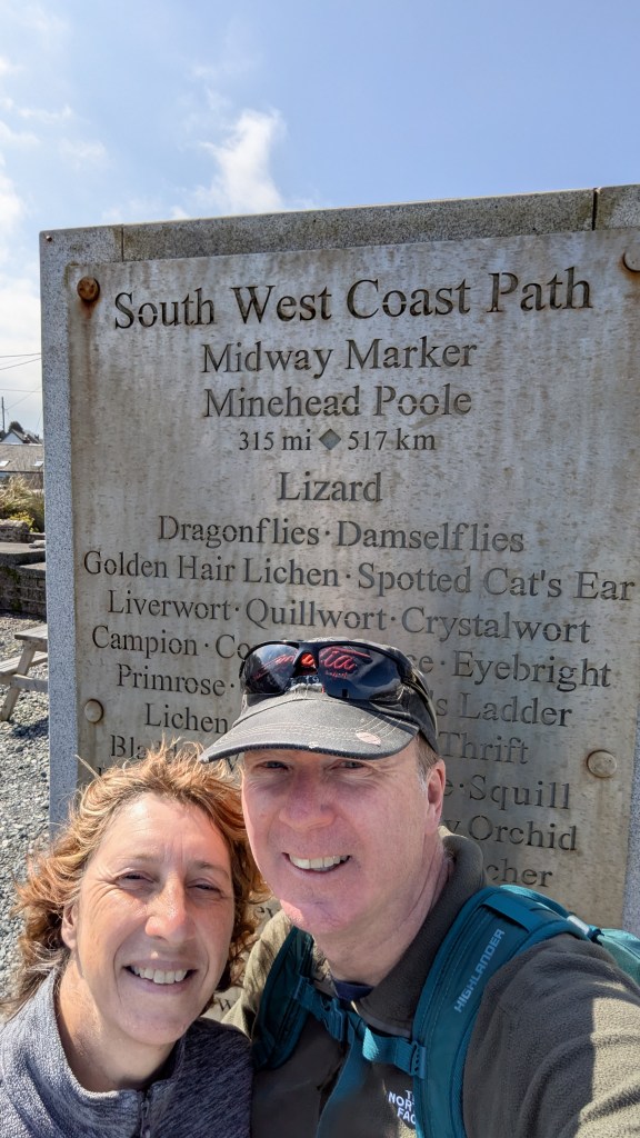 The route yet again went inland, with quite a bit of roadwork, aside from a woodland track section alongside some of the noisiest sheep I’ve ever heard. Getting back onto the road again took us into Porthallow-not just our stop, but also the official midway point of the Coast Path. Obviously, we posed at the marker, not sure if our random sections here and there added up to 315 miles [back at home afterwards, we realised we had walked more than that] whilst we wondered if we could check in early. Thankfully, our bed and breakfast host was happy to let us in, though as we had arrived ahead of our suitcase, we couldn’t shower and change just yet. With no other options available, both dinner and breakfast was provided by the host [nice little extra earner for him, glasses of wine on offer, what’s not to like?] and we met another couple walking the path-always nice to exchange stories!