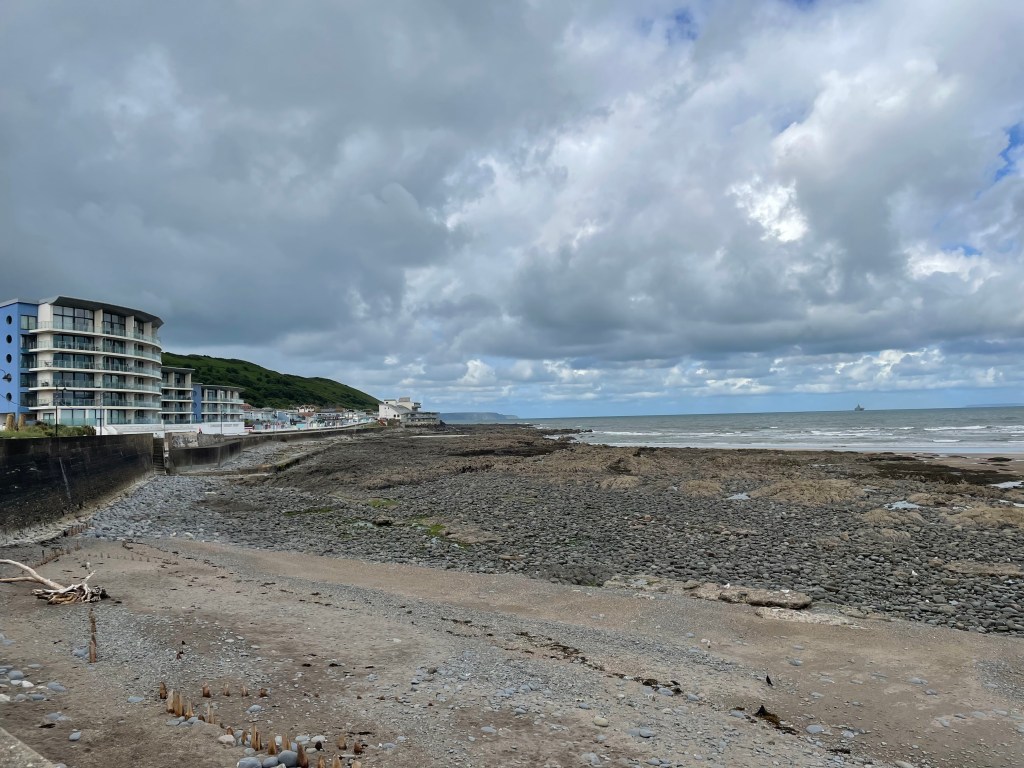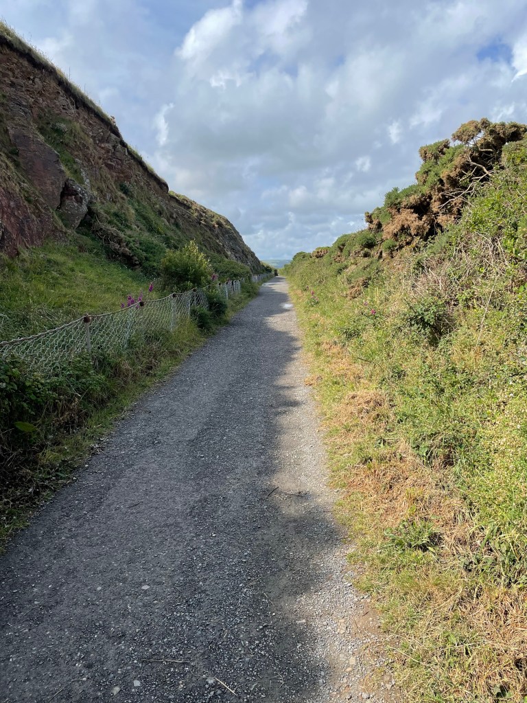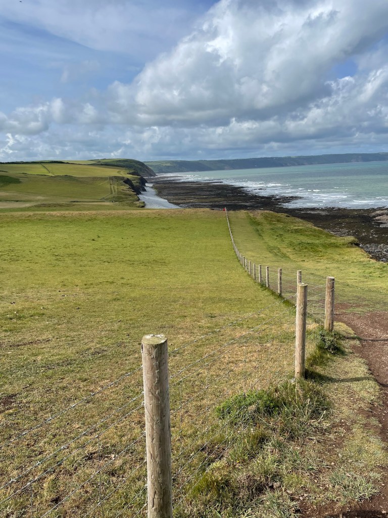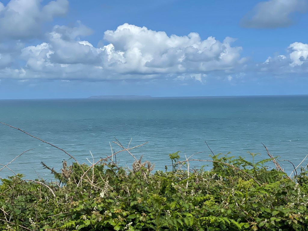 Next day, we got going about 10am, with a nice, easy start on tarmac through the town alongside the sea. It was very pleasant, but surprisingly quiet, and like many seaside towns nowadays, wears a slightly jaded air. It was overcast and gusty, but dry. On the edge of town, we passed “the famous” Seafield car park (a local business man leased it for 50 years from the council and immediately doubled the spaces and ripped out the parking meters, leading to it being featured as a small piece of parking heaven on a TV programme named Parking Hell!). The good vibes obviously rubbed off on me, as I started waxing lyrical about the sun coming out, the newly sheared sheep, and birds circling above us. I also took my first photo of Lundy Island, which would be our constant companion on the horizon this week.
