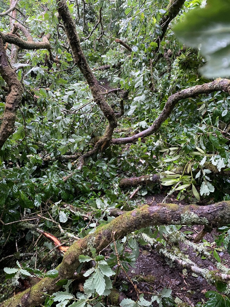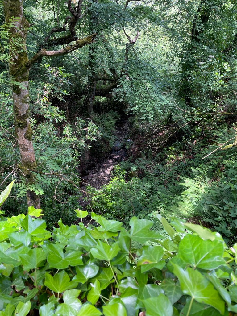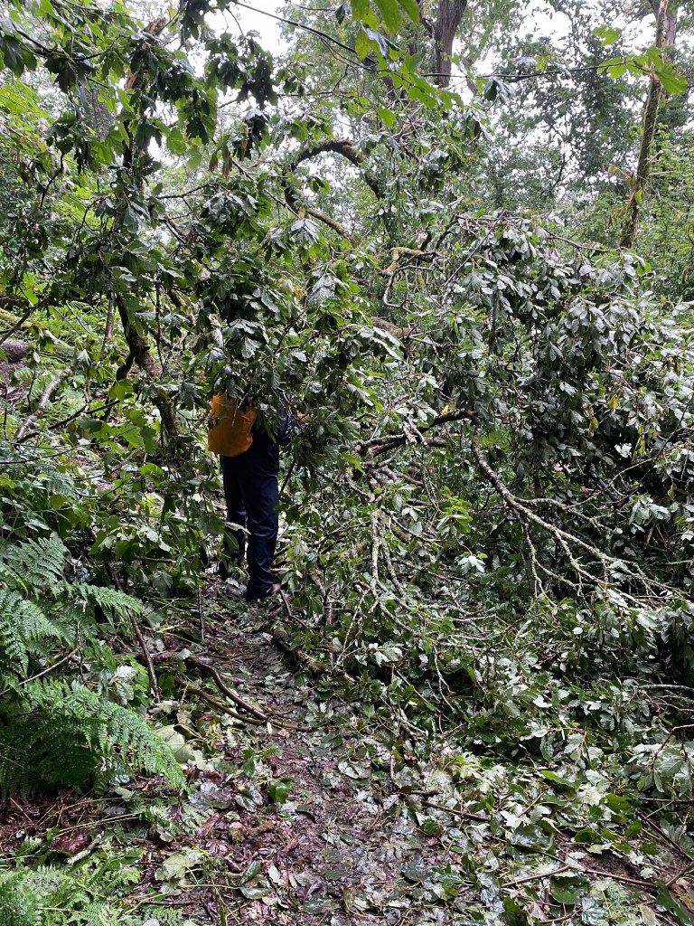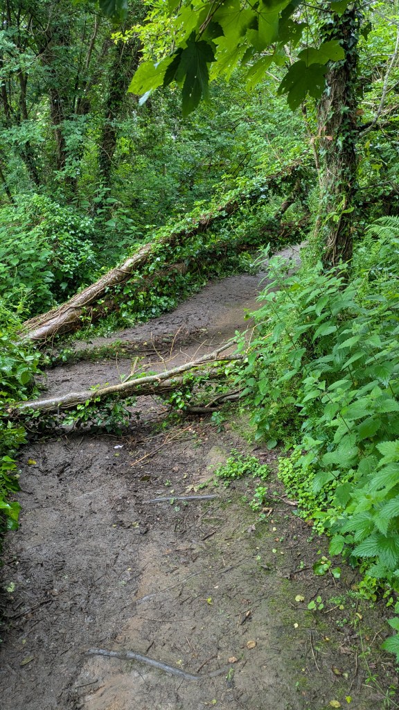 As it was drizzling I had put my waterproof coat on at the outset, but by 11.30am it was time to deploy my new more robust waterproof over trousers-these beauties have a full length zip, so can be put on without removing my boots. We had reached the woodland section now, so as well as the rain, we were brushing against wet foliage and dealing with mud underfoot. After popping out at the hamlet of Buck’s Mill, it was straight back into the woods and the first gasper (i.e. ascent) of the day. There was one area where the ground had slipped away right next to the path (see photo), so I pushed myself into the foliage to get past safely. Next, a couple of trees had fallen across the path, but they were easy to climb over; a little further on we came to a complete blockage! The route wasn’t visible at all, and Paul began to investigate a walk around just as I heard a voice asking if there was a way through. It was a walker trying to come from the opposite direction. She said she had already scrambled through most of it, so I told her to keep coming and she succeeded in breaking out! With no way around, we set about clambering through ourselves-wet branches flicked back in our faces and my hands got dirty holding branches up or down to climb over or under (I hate having mucky hands!) but we did find the path again (we reported the blockage to the South West Coast Path Association, but fellow walkers on Facebook said it had been that way for some months! Hopefully, it has been sorted now).