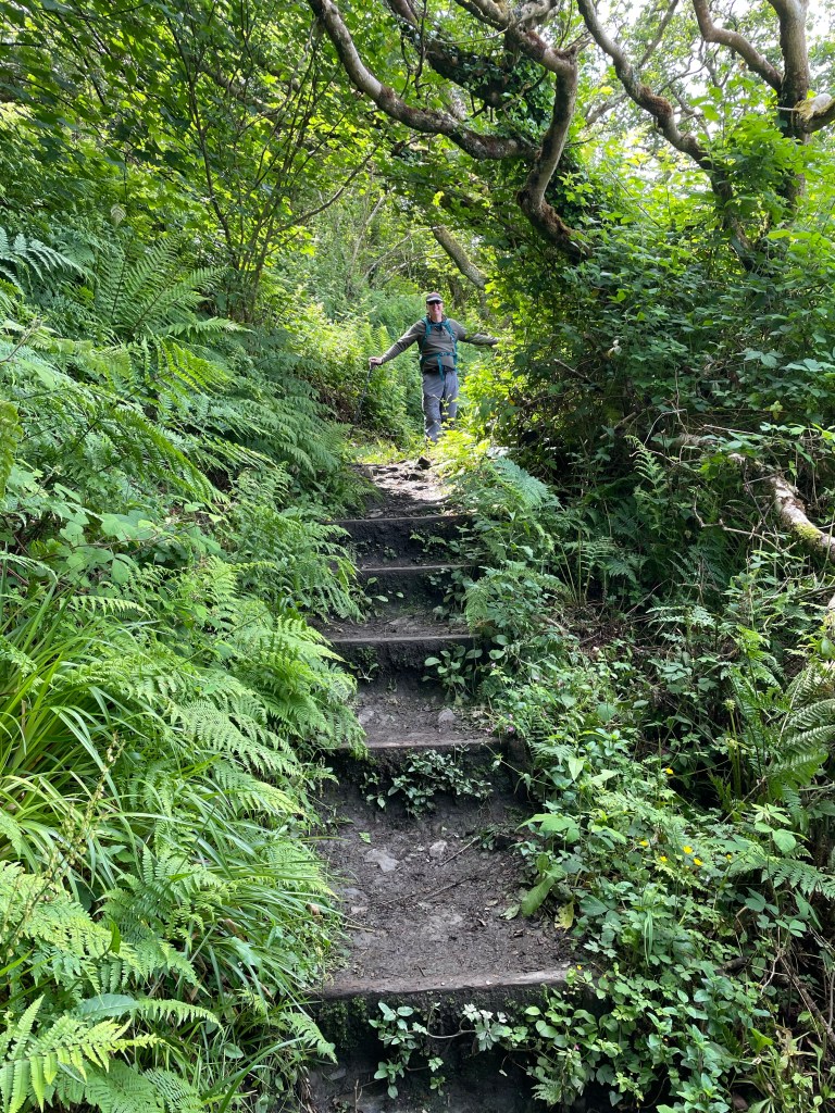 The track was, for the most part, earth with stones embedded within-exactly the type that had led to my calamitous fall on the previous leg, so I was taking great care. Doubly so when the path narrowed due to excessive foliage and became steep and muddy. It took us right down to beach level, a rocky, shingly one, so of course, after a mere 20 yards or so, we were heading straight back up again via a wooden set of steps.