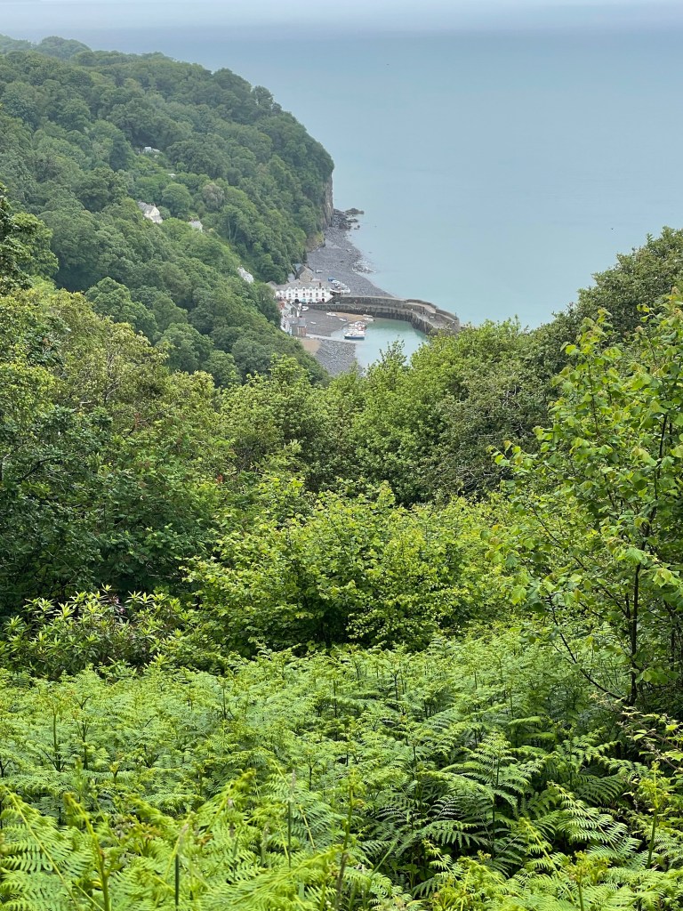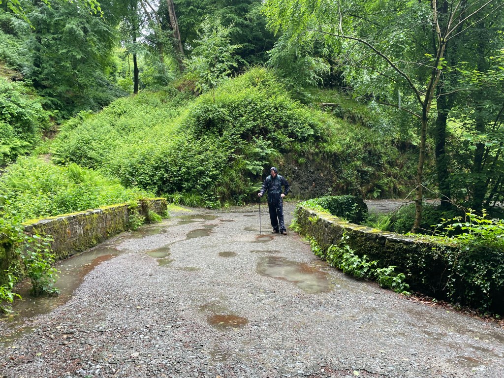 Clovelly, our destination for today, is not your typical village. In fact, it’s privately owned, so you need a ticket to park and enter if you wish to visit the various attractions (one ticket covers all). However, as we would be walking in, no fee for us! (The same rule applies at Land’s End, which is also privately owned, but doesn’t charge walkers on the Coast Path.) The village starts at the top of a steep cobbled street descending rapidly to sea level. Vehicles are prohibited, so there is a unique system in place for transporting goods and suitcases-they are placed on wooden sleds which are hauled up and down. First though, we had to get through a wet day in the woods…