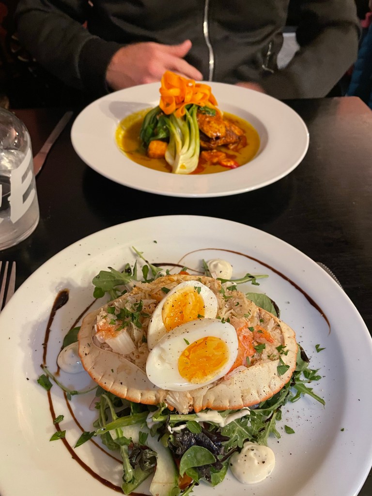 I had originally looked to stay at The Red Lion in Clovelly, a pub right on the harbour, possibly the last building in the village, but the quote was a ridiculous £250, so I had opted for The New Inn, halfway down instead, and less than £100, with the downside that we would have to share a bathroom with the other rooms on our floor (looking at the website, there seems to have been a renovation since). At that time it was basic, but clean and functional, and we were let in early, always a bonus! Despite my fears, the bathroom was only engaged once when I needed it, and all was quiet when I scurried along the corridor in the middle of the night (twice actually, ho hum). As for the pub itself over the road, there was nothing new about The New Inn, it’s been there for hundreds of years and some of the furniture looked just as old! It was dark, cramped and filled with very plain wooden chairs, but appearances can be misleading; the welcome was warm and the food was absolutely fabulous! I had fresh crab and was so impressed I took a photo before we tucked into it. A lovely meal and a bottle of wine is the best cure for one of the less enjoyable days on the Path. We were to be blessed with good weather from here onwards though, so just the terrain to deal with now!