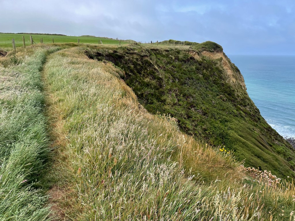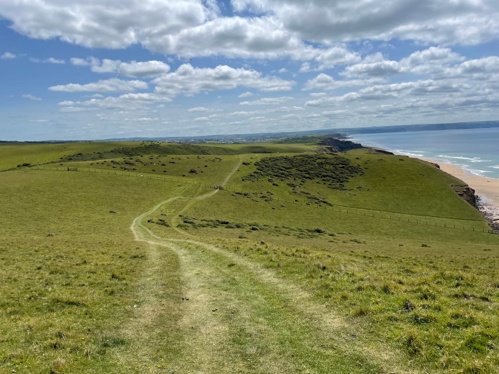 Ahead I could see walkers following a path along a high, narrow ridge which I did not like the look of one bit, but to my relief, the official Coast Path offered an alternate route along the valley beneath the ridge, followed by a gradual ascent to the cliff top. The sun began to make an appearance, and the going was good as we covered grassy tracks on ground as level as it gets!