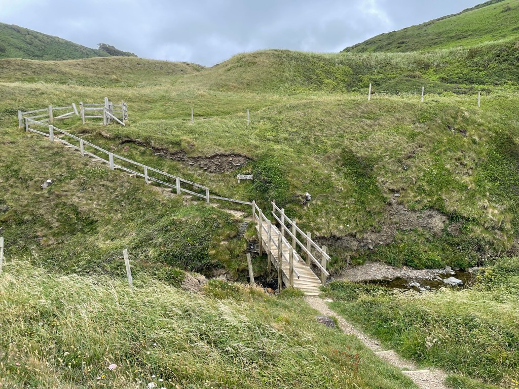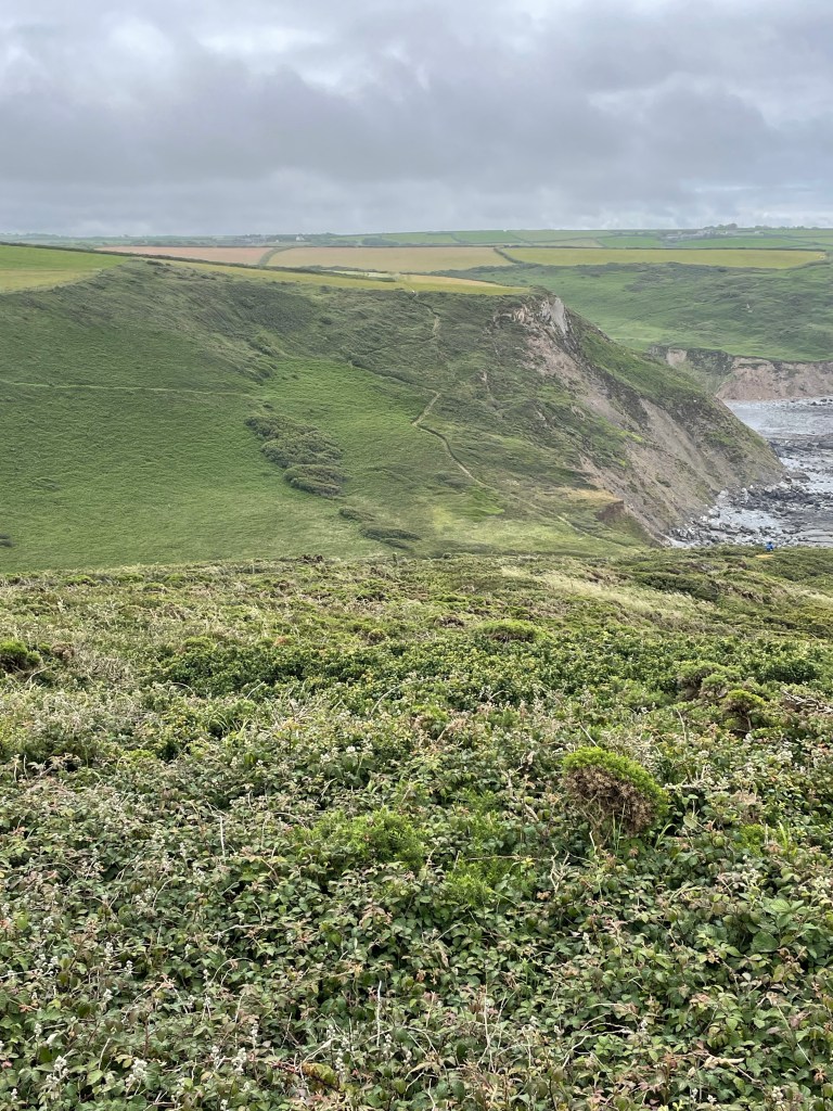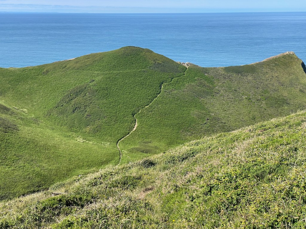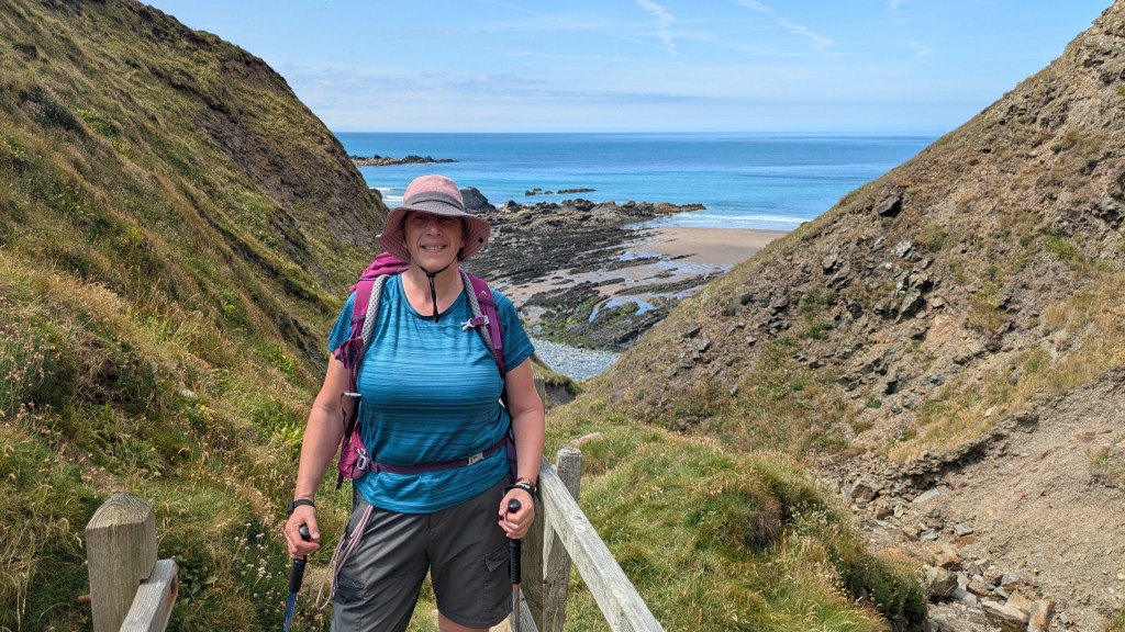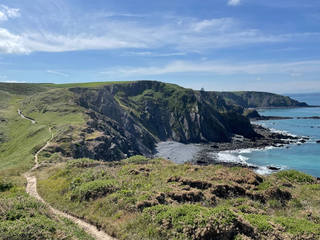 At 11.45am we stopped at a bench for a first lunch break (packed lunch provided by the Hartland Quay Hotel as there are no shops around there) and Paul gave me the welcome news that we had already covered half the distance for today’s walk, around four and a half miles. Although the toughest section was to follow, at least we had plenty of time to rest as necessary. Shortly afterwards, at Welcombe Mouth, we had crossed the first valley-we had to stop four times on the ascent, and were passed by a young woman with no poles as if it was nothing at all! Talking of poles, although they were absolutely essential, they had caused my first injury on this leg-a callous on my thumb! I wrapped some zinc oxide tape around it, but it was useless, the combination of my sweat and the friction just loosened the tape. (I have since purchased some fingerless gym gloves with pads on the palms to address this issue). As ever, one has to put up, shut up, and carry on regardless. The next valley was smaller, but had a blind summit-we kept thinking we’d reached the top only to find there was a bit more, then a bit more to go. By 1.30pm we had put valley number three behind us, so it was an opportune time to rest on a handy mound, have second lunch and congratulate ourselves on our progress so far, despite some punishing sets of steps.
