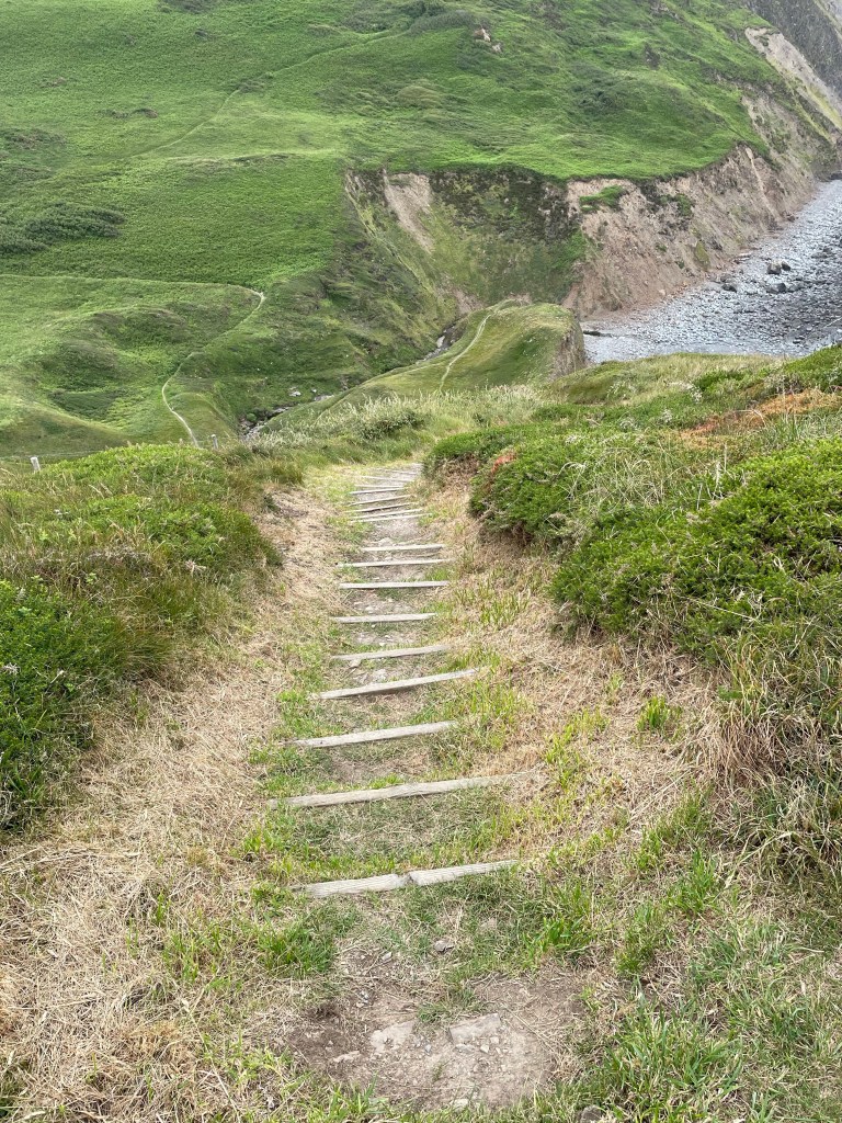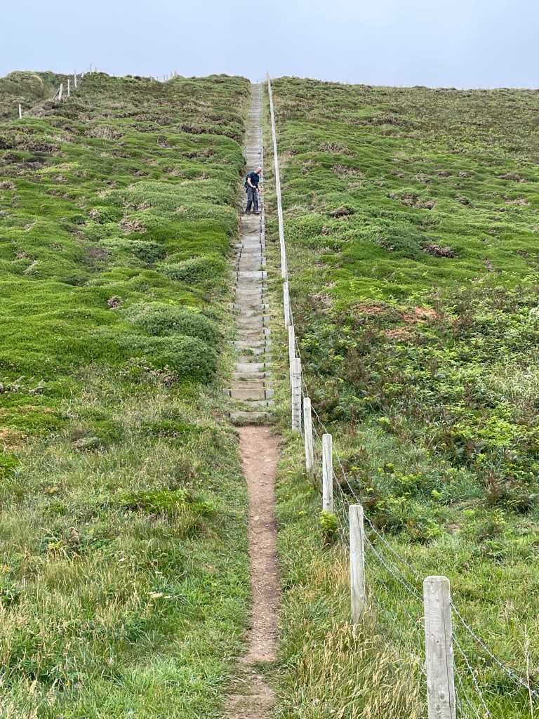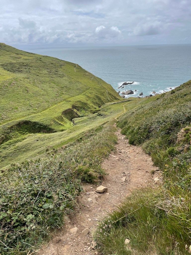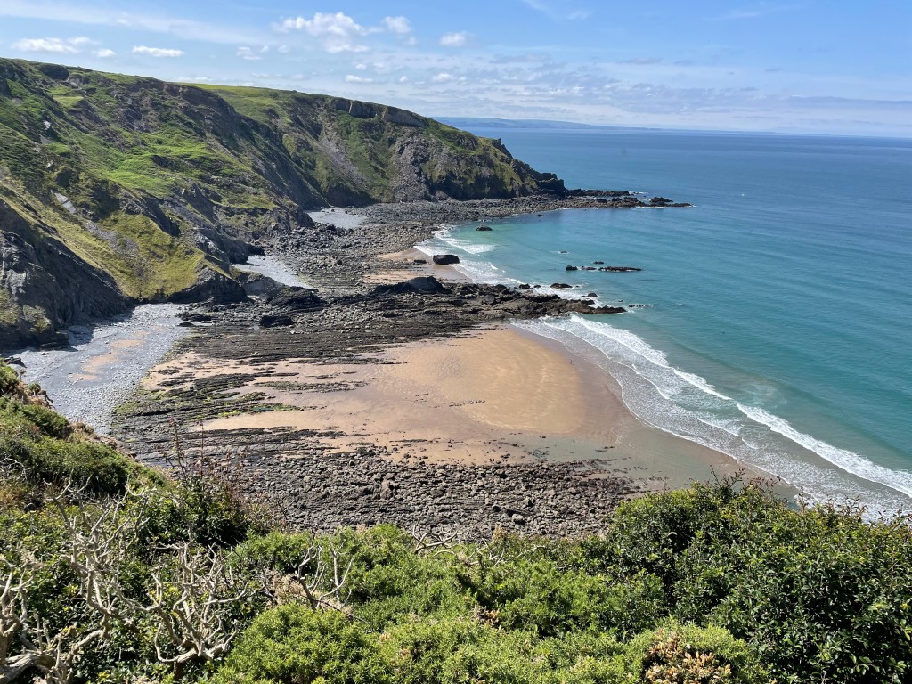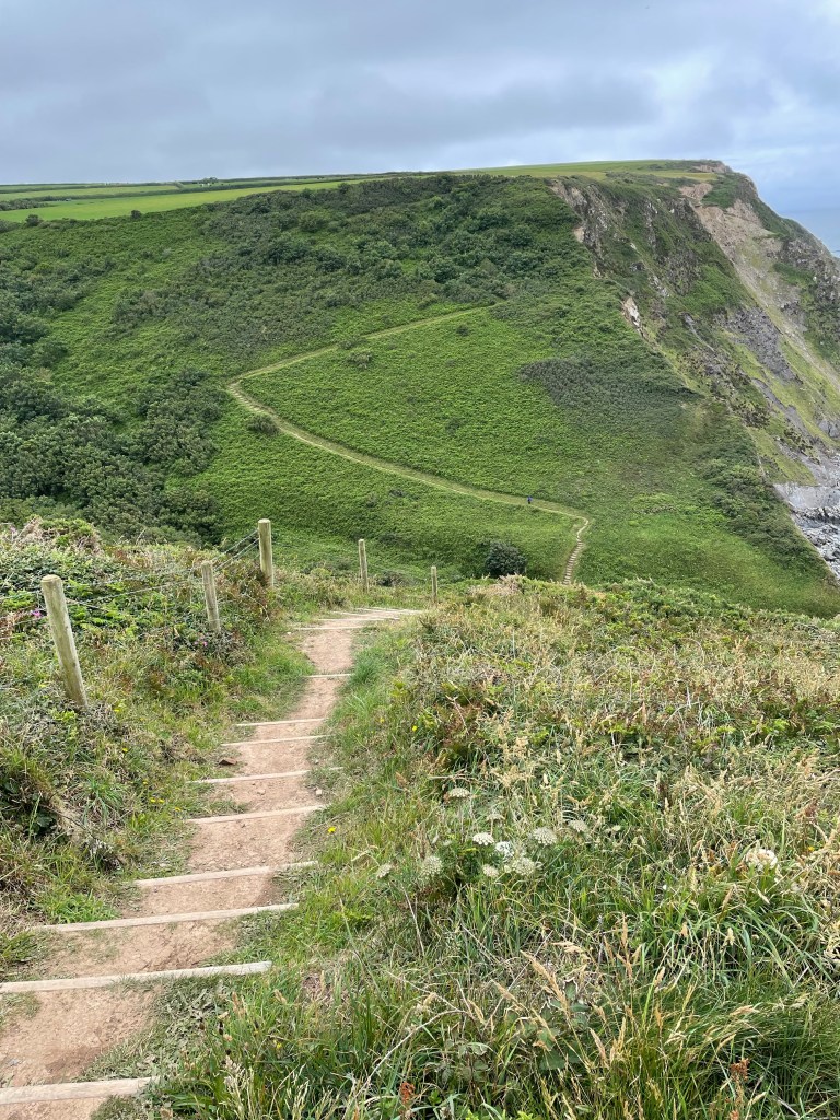 At 11.45am we stopped at a bench for a first lunch break (packed lunch provided by the Hartland Quay Hotel as there are no shops around there) and Paul gave me the welcome news that we had already covered half the distance for today’s walk, around four and a half miles. Although the toughest section was to follow, at least we had plenty of time to rest as necessary. Shortly afterwards, at Welcombe Mouth, we had crossed the first valley-we had to stop four times on the ascent, and were passed by a young woman with no poles as if it was nothing at all! Talking of poles, although they were absolutely essential, they had caused my first injury on this leg-a callous on my thumb! I wrapped some zinc oxide tape around it, but it was useless, the combination of my sweat and the friction just loosened the tape. (I have since purchased some fingerless gym gloves with pads on the palms to address this issue). As ever, one has to put up, shut up, and carry on regardless. The next valley was smaller, but had a blind summit-we kept thinking we’d reached the top only to find there was a bit more, then a bit more to go. By 1.30pm we had put valley number three behind us, so it was an opportune time to rest on a handy mound, have second lunch and congratulate ourselves on our progress so far, despite some punishing sets of steps.