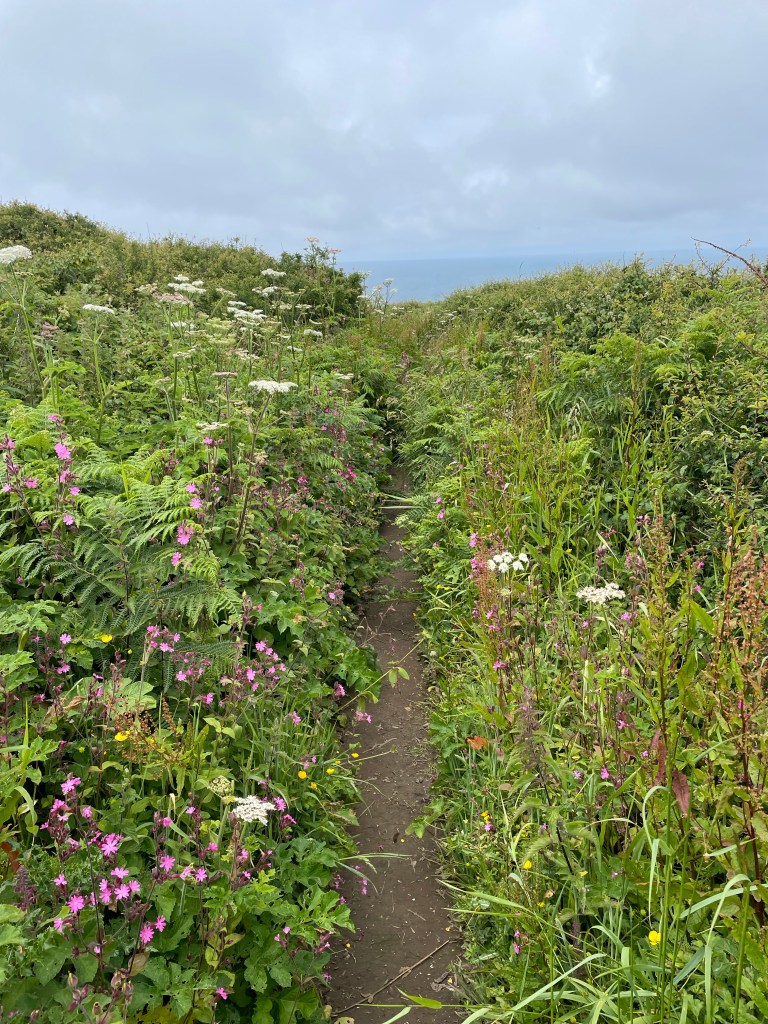 We had seen some radar dishes in the distance on the top of a headland, which, when we reached them, turned out to be GCHQ Bude. Paul went off to read some of the signs on the fence (it’s a man thing) while I worked out that although it looked as if the Path went straight ahead, we needed to go off to the right, through a pretty section of wildflowers, to hug the coastline. A short time before, we had passed T&K, which meant we were astonished to suddenly see them resting on a bench ahead of us! Apparently, they had walked straight on at GCHQ, cutting out the headland, though they had had to scramble over a fence to get back onto the Path proper!