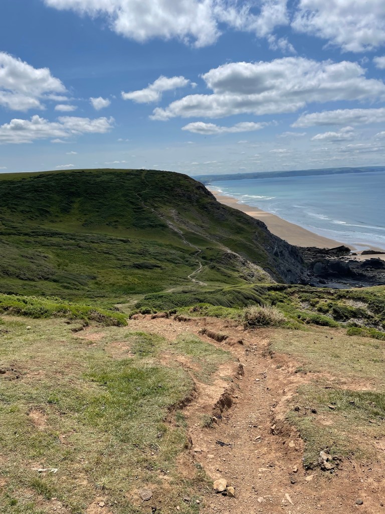 Toilets! Cider! Ice creams! Much as I love the remote sections of the Path, I must confess the parts closer to civilisation have their attractions too. We desperately needed refreshments today because the weather had suddenly remembered it was June, ergo summer, and the sun hadn’t just made an appearance, it was absolutely scorchio! Actually, Paul had got caught out yesterday; because it was still a little fresh, he hadn’t realised how strong the sun was (although, maybe it was the wind?) and after showering, his face and neck had emerged glowing a subtle shade of beetroot. Sun hats in place, we set off at 9.45am to tackle valleys six to ten.