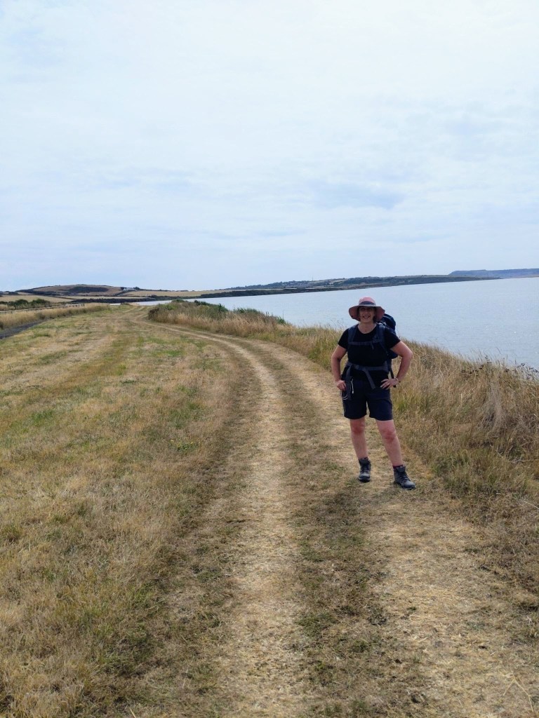 On this western side, we were hugging the shoreline of the Fleet Lagoon, which is the body of water trapped between Chesil Beach and the mainland. Once past a holiday caravan site, there were fields on our right with crops or livestock, and over the water, the shingle forming Chesil Bank. Looking behind us, Portland already seemed miles away, I could hardly believe we had walked from there! The Path was quite pleasant going, very dry, with a short section across the lagoon beach, and relatively level. There was a minor panic when we came to a military area, but there was no red flag flying, so we were safe to proceed. At yet another holiday park, we took the opportunity to rest on the grass, where the photo of me lying flat out was taken! I recorded quite a positive note here, saying how proud I was that, despite both of us having issues, we were on course to cover the final three miles in time for our Airbnb check in time of 6pm. I was falling out of love with my rucksack though-it was lovely to take it off, and horrible to heave it back on.