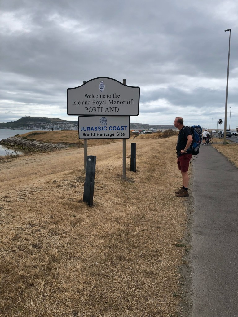 Rucksacks packed with the bare minimum, but still a significant weight compared to the training walks, we caught the 8.09 bus to the station and the 8.52 train to Weymouth which took about an hour. We planned to “avail ourselves of the facilitays” as Paul likes to say, before setting off, but there are no loos at Weymouth station any more [apparently, they kept getting vandalised, so they got closed!] so we took a minor detour to Wetherspoons first [I moan about Spoons regularly, but they’ve proved exceedingly handy on many an occasion]. We began with another slight deviation-the official Path goes along the seafront and has you taking a ferry [in the form of a rowboat, we believe] to get across the harbour. We decided to walk down the main street and simply cross the bridge instead! After passing through a residential area, we then picked up the Path, a nice bit of level tarmac heading towards Ferrybridge, the link between Portland and the mainland.