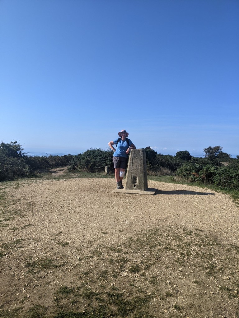 I look pretty relaxed and casual leaning against the trig point atop Golden Cap, which doesn’t really convey just how GOOD I was feeling; although I’m wearing the knee support, I didn’t need it. For the first time since I hurt it walking on Portland in the summer, my knee felt normal again. The twinging and sometimes outright pain had been ruining my enjoyment of the walks, so it was a wonderful surprise to set out on this third day and focus on the actual walking rather than my body! I had felt positive as we set off from Chideock, the weather was warm and glorious as a summer’s day, my blisters were well protected, and the only blip had been Paul breaking his sunglasses! We deployed the sun hats and set off for the coast.