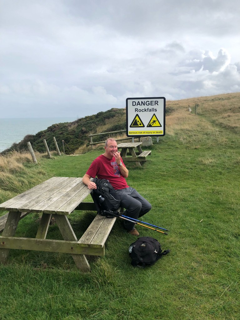 Inland, aside from some sheep, the grassy fields were relatively featureless, but the coastline was something else; a series of bays and coves edged by jagged white cliffs making a “v” shape by plunging steeply downward before ascending again. I had the walking poles to assist on the uphill sections, and I confess I accepted Paul’s offer to carry my backpack on the steepest bits. [I had managed well with it in September, but because I now had a coat and waterproof trousers, it was heavier than last time.] My pack was about to get lighter though, as we decided to wear the waterproofs – ahead and out at sea, we could see a blue-grey cloud with the tell tale downward streaks of rainfall, so we thought we’d get ahead of the game. Oh, how foolish we were to think we could anticipate the vagaries of British weather, our smugness dissipated as swiftly as the rain cloud travelled northwards away from us, and, in short order, I was boiling hot! We had descended to Worbarrow Bay at this point, where we made the decision not to take the mile long round trip to visit the abandoned village of Tyneham [the villagers were evacuated during WWII for the duration, but the MoD never gave it back. We figured it would make a nice motorbike trip out instead]. I sat on one of the ricketiest picnic tables I’d ever seen [no warning sign for this, eh, MoD?] so we could remove our outerwear in preparation for the steepest and longest climb of the entire walk to date. Even young people were resting half way! Ah yes, in contrast to the day before, plenty of other people were out and about enjoying the area today.