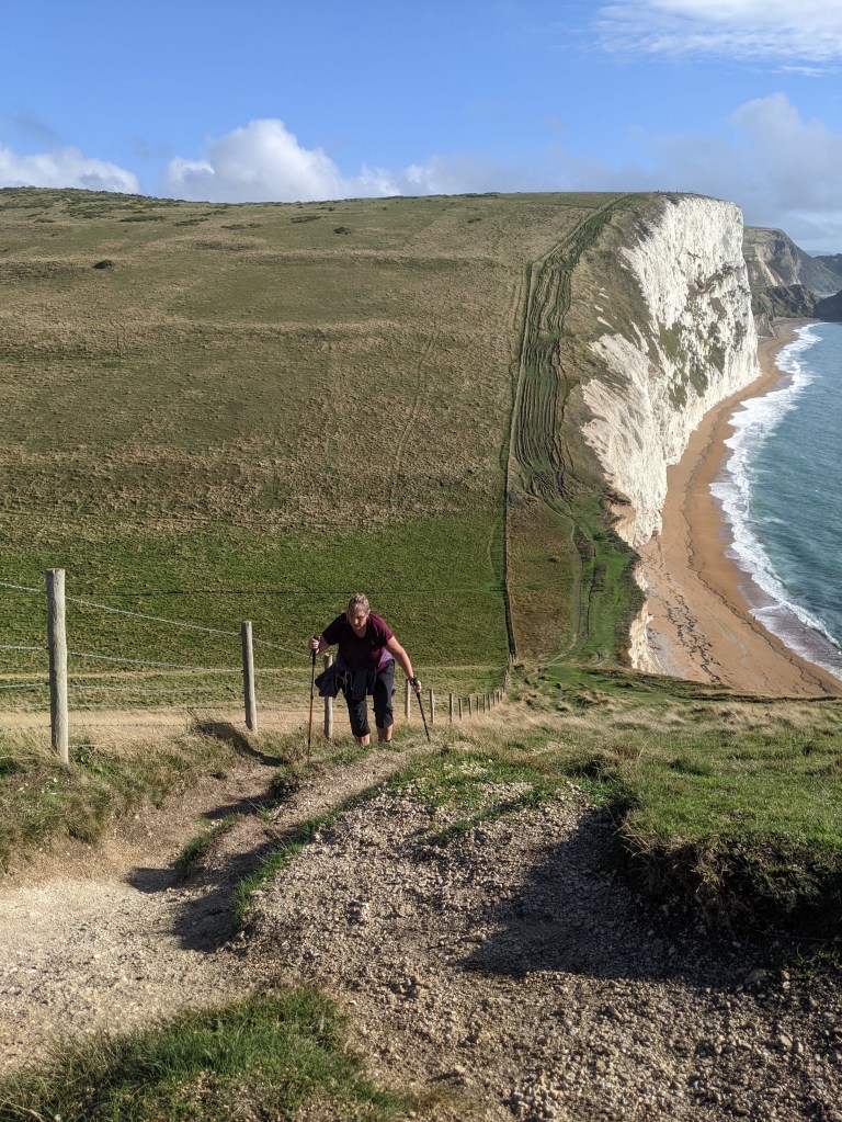 The day began with an argument between Komoot, our walking guide App, and myself [to be honest I can’t actually remember the details now, but my voice memo states that I was right!] and we ended up exiting the village via a long slope of stone paved steps. Alas, we were not done with steep ascents just yet! However, once at the top of the steps, it was a pleasant stroll to Man O’ War beach, and on to the well known landmark of Durdle Door. The Sunday sunshine had enticed plenty of people out, despite being late October [we Brits evidently can’t resist a well known natural landmark] though only a few of us hardier types were actually walking the Path!