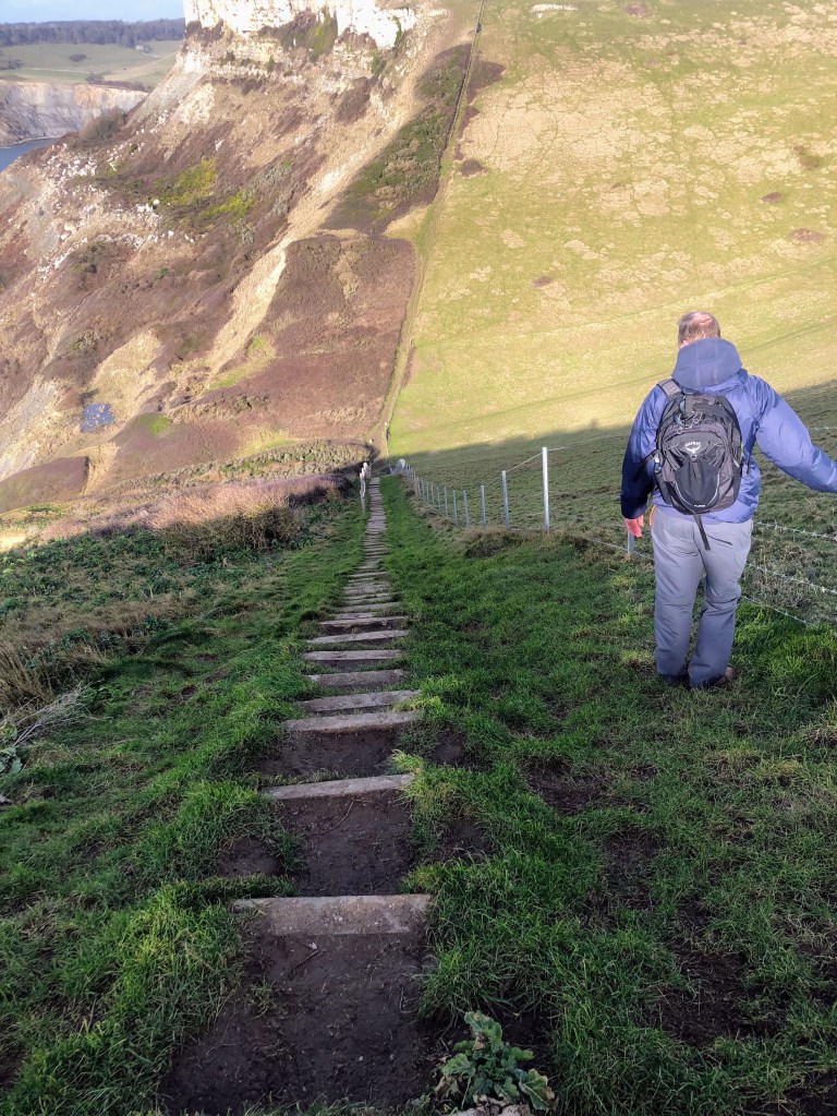 I took a photo of Kingston church as we walked along the road to the coast, past a row of cottages. All was peaceful, but as the road became a footpath, the wind began to pick up, and the sky was a moody shade of grey. Our first hazard was a stile leading into fields of sheep [cue some gentle ribbing of Paul along the lines of how relieved he must be they weren’t cows] but there was still a proper path for us to follow, though it was utterly splattered with sheep poo. My ears started feel the cold headwind, so I dug out my Nordic style woolly hat [what an excellent last minute decision to pop it in my backpack] and as we joined up with the Coast Path at Chapman’s Pool [not a pool but a small cove-we’ll get a better look at this when we cover the final missing section on a day walk around St Aldhelm’s Head] we suddenly felt the full force of the gusting wind. Unlike our last walk, when the sea was like a pane of glass, today it was roiling and noisy, with multiple waves surging up to the shore, and the horizon barely visible as the greyness of the sea and sky merged. We turned right, heading west, to be immediately faced with a steep flight of steps cut into the grassy slope – there was some shelter from the cliff top initially, but when we came to a break in the cliffs, the force from the wind was tremendous. Our weather app indicated a wind speed of roughly forty five miles per hour! My voice memos are almost drowned out by the sound of it. Climbing was hard enough, but trying to maintain my balance at the same time was the most leg sapping thing we’d done since traversing the shingle on Chesil beach. We had to take three breaks on the way up [“182”, indicating number of steps, was scratched into the top stone] and normally would rest again at the top, but we were very close to the cliff edge and totally exposed to the fierceness of the gusts, so there was no choice but to push on, exhausted.