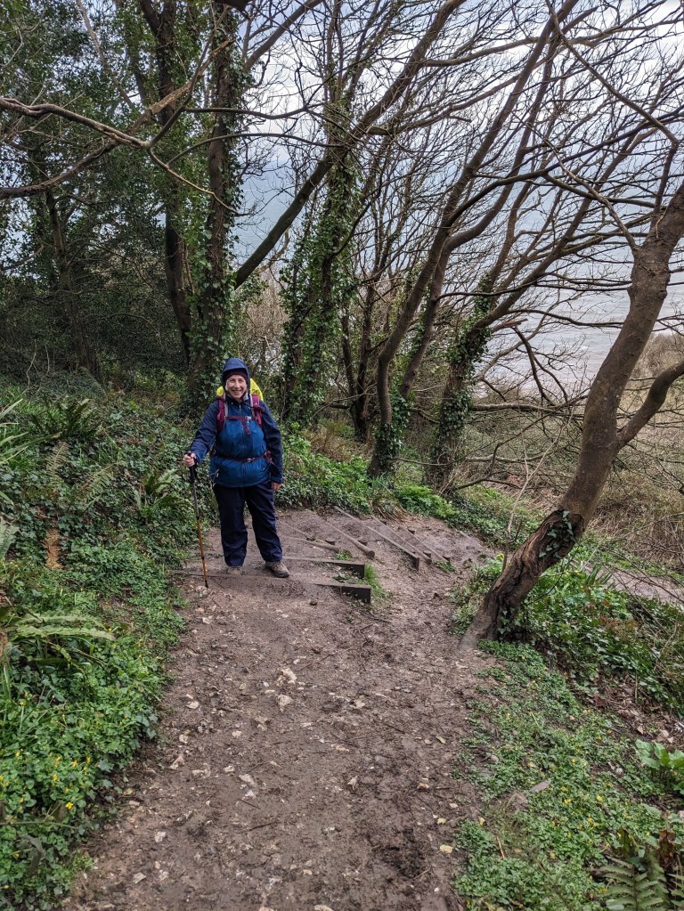 Whereas there had been periods of sunshine yesterday, today the full cloud cover made for a gloomy atmosphere and chilly conditions, though whilst walking we were warm enough. The path angled inland and upwards through woods, and there was plenty more mud, though the myriad tree roots gave our feet some purchase. When we emerged from this section we could see Sidmouth in the valley below, and beyond, the ups and downs we would have to tackle the next day. First was the descent into town, through a grassy area that serves as a garden of remembrance, with benches, plaques and flowers dedicated to loved ones. On the edge of town, we passed two rather grand hotels harking back to the Edwardian era, but Sidmouth is still popular, the place was buzzing with crowds enjoying its genteel seaside charm even though we were ahead of the school Easter break. We aimed for the Dukes Inn, where we planned to have a drink and get the passport stamped [we could have stayed there too, but it was quite pricey, so we had opted for an AirBnB room instead]. Unfortunately, Dukes was closed, and I was bemoaning the curse of the passport, when we were directed to the Elizabeth hotel next door – the receptionist there was very helpful and actually went into Dukes to find the stamp for me [I think they must have the same ownership]. As we threaded our way through the town to our stay, we stopped to buy sandwiches for the next day – I had the feeling tomorrow’s lunch would not be such a comfortable affair, the weather was beginning to worsen. Wind, rain, and heavy fog awaited – find out how much we suffered in the next post!