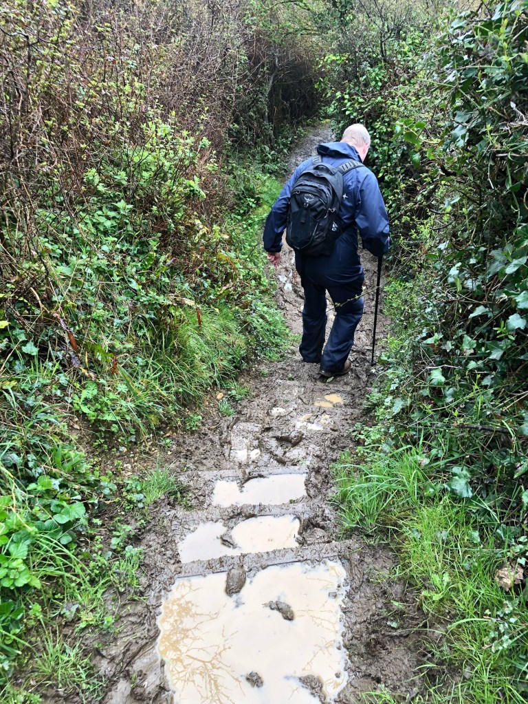 We carried on in the light but persistent rain, ascending from the beach. Below we could see the surf throwing up piles of creamy foam onto the shingle. My memo refers to the path as “treacherous” and Paul nearly fell in one place. We really did try to stay upright to avoid injury and getting any muckier than we already were! The track eventually got easier as we approached the village of Branscombe where we would be staying, and we could see our target nestled in a valley, slightly inland. We arrived at The Mason’s Arms about three o’clock, and were thrilled with our room. A lovely double bed, huge bathroom with separate bath and shower, and a lovely meal in the pub later. Highly recommend it for a stay and/or meal if you’re in the area.
