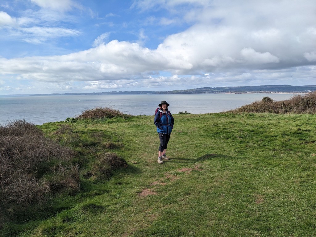 The next day was Sunday, and we started with a mooch around Exmouth marina – it was dry and sunny but with a chill in the air. It was all rather quiet along the seafront initially, with a sense of faded grandeur from the row of Edwardian villas. However, as we reached the eastern edge of town, the sandy beach was full of life; joggers, cyclists, swimmers, rowers, fellow walkers and hordes of dogs [in my voice memo I say every dog owner in Exmouth must be there – later we chatted to two locals who said that dog owners travel miles, even from Bristol, to walk their pets on Exmouth’s sands]. Although not yet Easter, there were facilities catering to the crowds, cafes, ice cream and toilets, though we weren’t ready to stop yet having barely got going!
